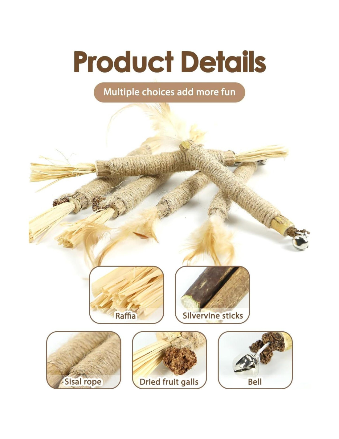 - MUCHAS OPCIONES: Incluye 10 piezas de juguetes para gatos, 2 palos de silvervine con rafia y galls de fruta seca, 2 con plumas y campana, y 6 pequeños palos de silvervine. Varios estilos para satisfacer las múltiples necesidades de su gato. El juguete para gatos de autojuego es adecuado para todas las razas de gatos.