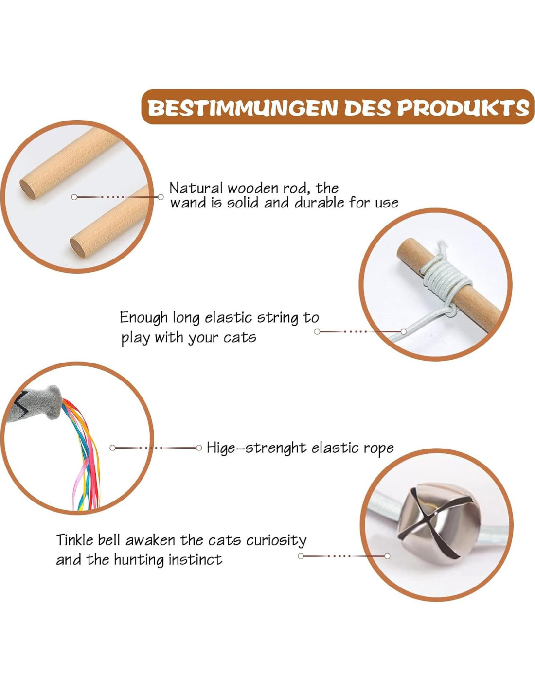 - [Alta calidad y seguridad] El juguete de varita para gatos está compuesto de madera natural, tela resistente con una cinta de fieltro suave y colorida unida al final. Seguro, ecológico, duradero. Todos los juguetes para gatos tienen un diseño engrosado que es flexible, por lo que no lastimará las patas de los gatitos mientras es duradero. Nuestra cuerda elástica para el palo de gato es más fuerte que la cuerda normal, puede extenderse hasta 19.7 pulgadas (50 cm). Eso será seguro para que tus mascotas lo usen.