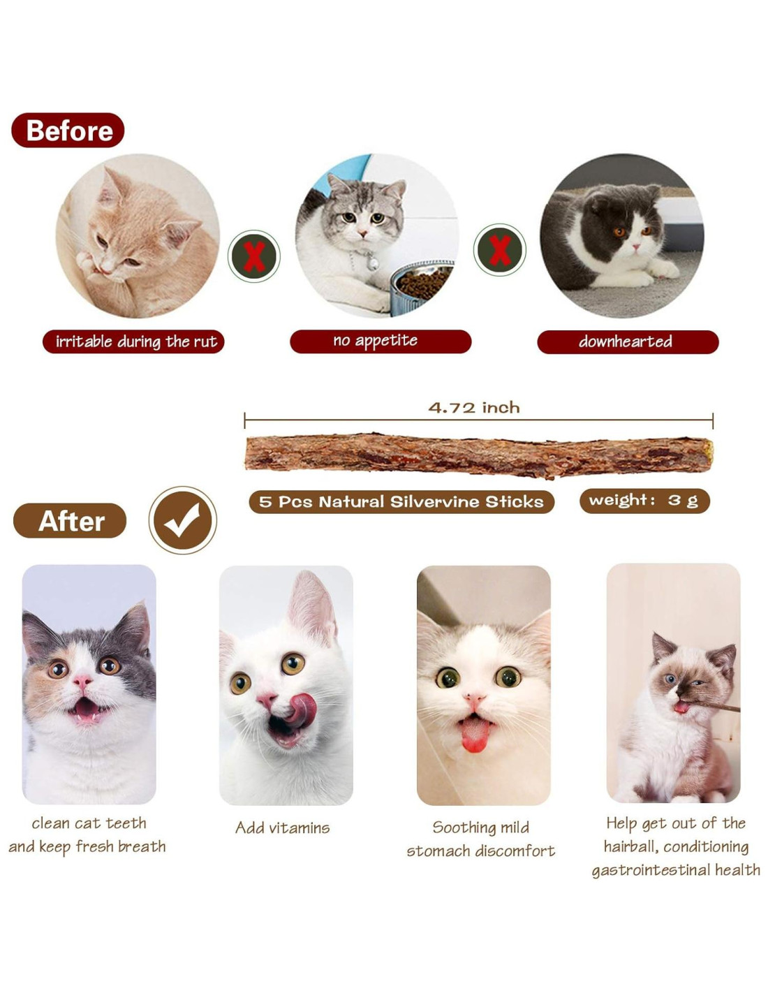 - [Palos de silvervine] Los palos de catnip se cosechan de la planta de silvervine, 100% natural. Los palos de silvervine para gatos son saludables y seguros. Los palos de silvervine pueden eliminar eficazmente la placa dental y el sarro, eliminar el mal aliento y proteger la salud oral mientras que masticar ayudará a tu gato a relajarse y reducir su ansiedad. Alimenta directamente a tus gatos o corta la piel de los palos. Después de un período de uso, para mantener el efecto, necesitas cortar la capa usada.