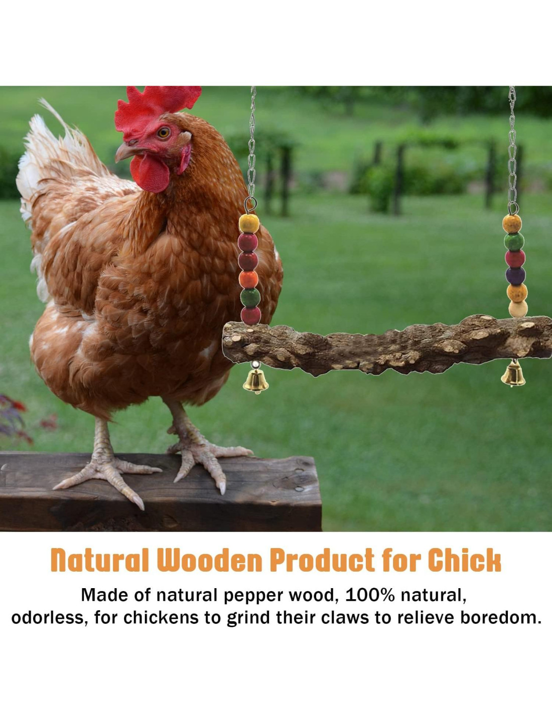 - [Seguro y duradero] El columpio para aves está hecho de madera de pimienta natural y metal, lo suficientemente duradero como para durar años. Esta percha para pollos tiene cuentas coloridas y pequeñas campanas en la cadena, los colores y formas atractivos animarán a los pollos a jugar y masticar y aliviar el aburrimiento.