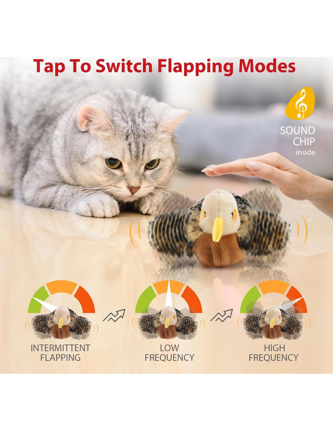 - JUGUETE INTERACTIVO PARA GATOS: Cada vez que tu gato toca este juguete para gatitos, el juguete para gatos aburridos canta, aletea y revolotea como un pájaro real. El juguete de pájaro para gatos despierta el instinto de caza de tu gato y los mantiene hipnotizados.