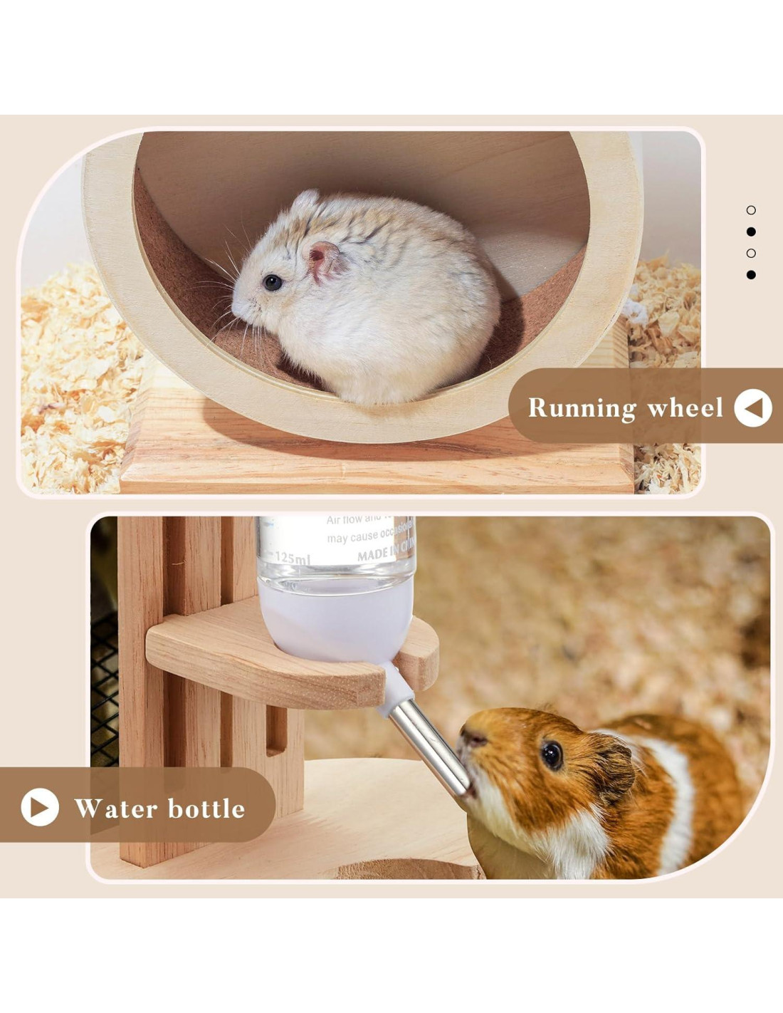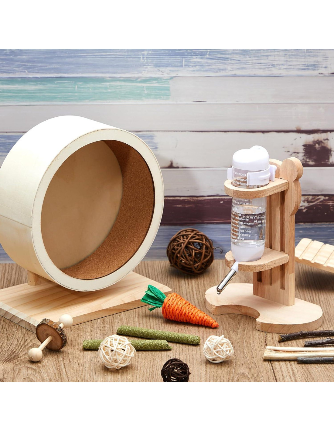 - Materiales de madera seguros y robustos: los materiales de madera aplicados en este conjunto de accesorios para hámster no solo ofrecen robustez sino también seguridad debido a su resistencia a la masticación; Por lo tanto, ya sea que estén haciendo ejercicio o hidratándose, su mascota puede hacerlo de manera segura sin riesgo de ingestión accidental; Como las mascotas pequeñas tienden a masticar cosas, estos materiales seguros pueden garantizar su bienestar.