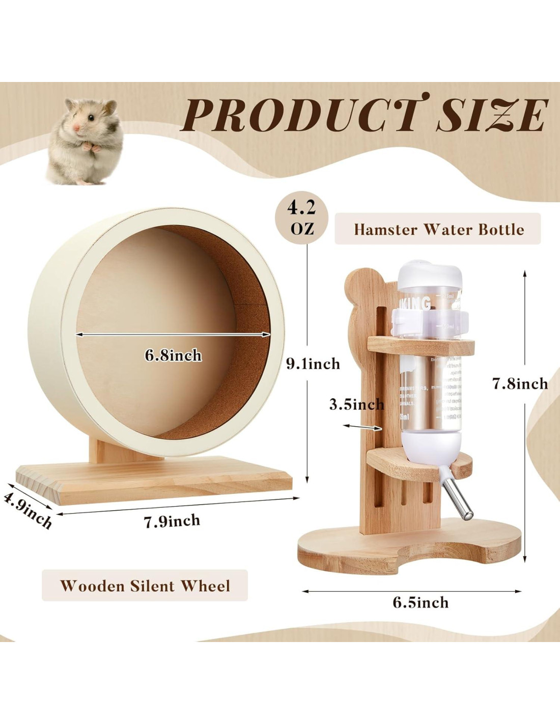 Características: Hecho de madera y plástico, los materiales aplicados no solo son atractivos sino también prácticos para facilitar las actividades diarias de su mascota, como el ejercicio y la hidratación. Esta practicidad se extiende al bajo nivel de ruido de la rueda de hámster, asegurando un ambiente tranquilo incluso durante las horas de actividad de la mascota. Este juego de rueda de hámster de madera y botella de agua para mascotas pequeñas satisface las necesidades de ejercicio e hidratación de su mascota sin tener que gastar mucho tiempo en la selección. Además, podría servir como un regalo ideal para los dueños de mascotas en su círculo. Especificaciones: Material: Rueda de hámster: madera Botella de agua para hámster: madera, plástico Color: marrón, blanco Tamaño: Rueda silenciosa de hámster de madera: 7.9 x 9.1 x 4.9 pulgadas / 20 x 23 x 12.5 cm Botella de agua con soporte de madera: aproximadamente 7.8 pulgadas / 20 cm de alto, 6.5 pulgadas / 16.5 cm de ancho en la base, 4.2 oz / 125 ml de capacidad. El paquete incluye: 1 x Rueda silenciosa de hámster de madera 1 x Botella de agua para hámster con soporte de madera Notas: Medición manual, por favor permita ligeros errores en el tamaño. El color puede existir una ligera diferencia debido a diferentes pantallas. Antes de la compra, confirme si el tamaño del producto es adecuado para su mascota y observe la reacción de la mascota al usarlo. Por favor, retire el producto a tiempo si hay alguna incomodidad.