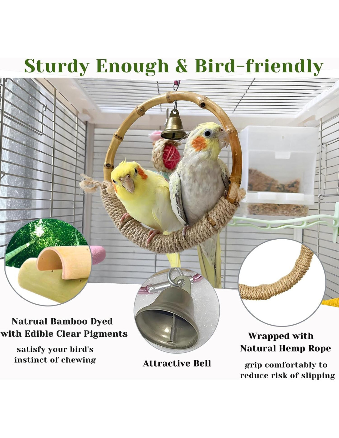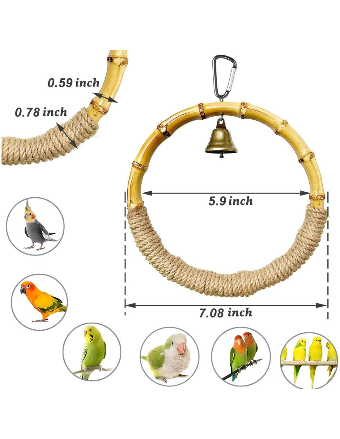 - Calidad de Seguridad: 1 El anillo de columpio para loros está hecho de madera natural y clips, es amigable para las aves. 2 Envuelto con cuerda de cáñamo natural, nuestro columpio para aves proporciona un agarre cómodo para reducir el riesgo de que las aves se resbalen o se lesionen