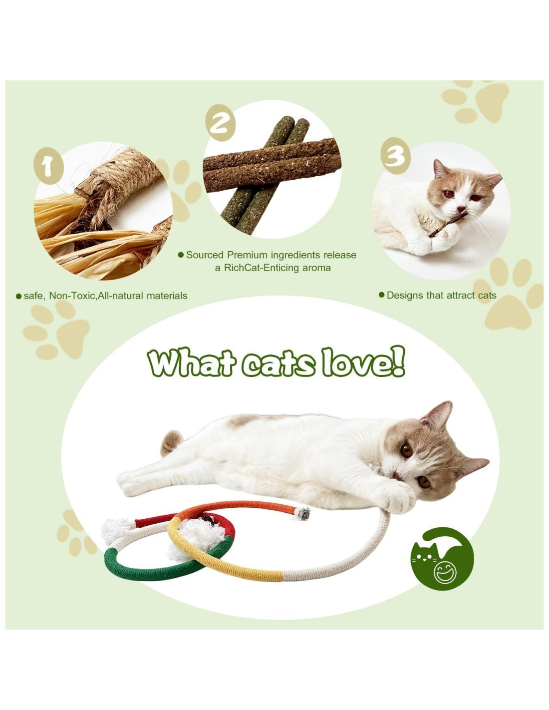 - Palos de silvervine para gatos de 12 piezas: Un cóctel de silvervine, fruta de gallo, hierba raffia y sisal duradero entrega nepetalactona, actinidina y resveratrol, el trifecta que el 98 % de los gatos encuentran irresistible. Un olfateo provoca euforia, derrite el estrés y convierte incluso a los leones de sofá en cazadores juguetones.