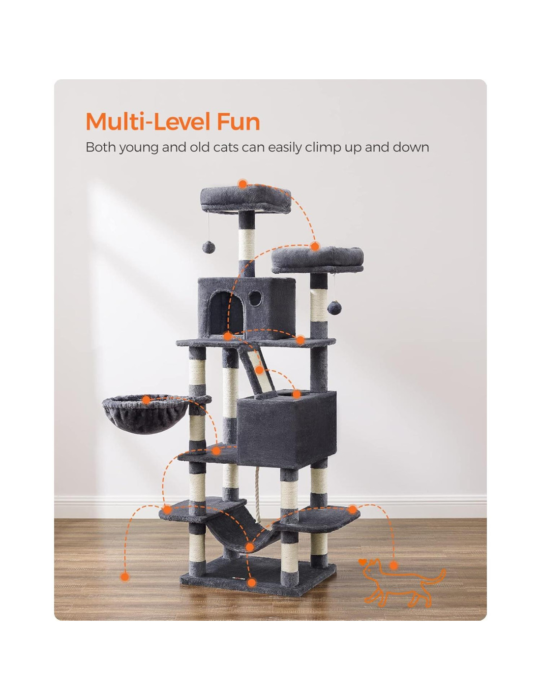 Si necesitas reemplazar un pompon o no eres fan de los ruidos de campana, este árbol para gatos viene con un pompon de repuesto sin campana. El árbol para gatos está completamente cubierto con tela de felpa suave, por lo que tus pequeñas bolas de pelo se sentirán cómodas dondequiera que estén. Tus gatos se relajarán cómodamente en las perchas de este árbol para gatos, durmiendo todo el día o explorando la casa. Materiales de calidad, una base reforzada y un kit anti-vuelco aseguran un lugar estable y seguro para que tus gatos salten hacia arriba y hacia abajo. Todo el árbol para escalar gatos está cubierto con felpa suave para una comodidad reconfortante. Con 2 pompones, una cuerda de juego, 2 cuevas, una canasta y una hamaca, tus gatos nunca se aburrirán en esta torre de juego para gatos. 13 postes para rascar y 1 rampa para rascar entretienen las garras inquietas para evitar que arruinen tus muebles. Tanto el diseño de varios niveles como la rampa facilitan el ascenso y descenso. Color: Gris Humo. Material: Tablero de partículas, Felpa, Sisal. Tamaño del producto: 21.7"L x 17.7"W x 66.1"H (55 x 45 x 168 cm). Peso del producto: 40.6 lb (18.4 kg). Capacidad de carga estática máxima total: 143 lb (65 kg). 1 x Árbol para Gatos. 1 x Kit Anti-Vuelco. 1 x Kit de Accesorios. 1 x Instrucciones. Si tu amigo peludo comienza a morder o comer el pompon o la banda elástica, por favor retira los juguetes y mantenlos fuera del alcance de tu amigo peludo por un tiempo. Si la cueva para gatos está rasguñada y dañada por patas traviesas, por favor repárala o reemplázala antes de continuar usándola para evitar el riesgo de lesiones a tu amigo peludo. Debido a que a los gatos les encanta saltar y jugar, por favor fija la torre para gatos a la pared con el kit anti-vuelco incluido para un uso seguro.