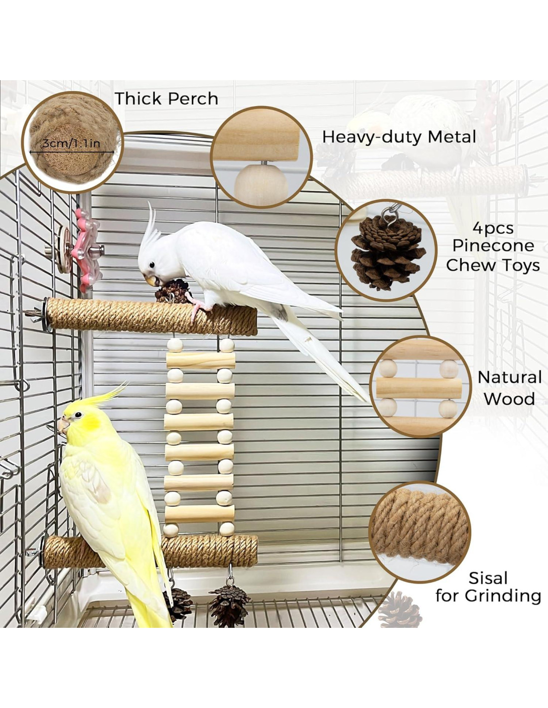 - Pino Interactivo para Involucrar: 4 plataformas de percha natural para aves con piñas despiertan la curiosidad de las aves. Ideal para periquitos y cacatúas para picotear, escalar y explorar. Mantiene a las aves ocupadas, reduciendo el aburrimiento mientras promueve la salud del pico