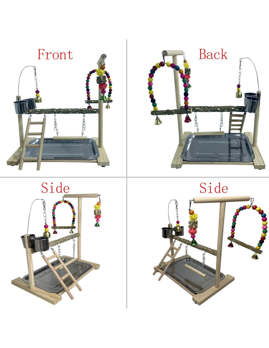 - Tazas de Comedero y Base de Acero Inoxidable: Nuestro soporte de juego para loros viene con dos tazas de comedero de acero inoxidable que permiten al ave comer o beber mientras juega y descansa. La bandeja de acero inoxidable se puede quitar para limpiar, enjuagar con agua, duradera en uso. No se aplica pintura ni pigmento a la barra de madera, lo que mantiene el color natural y original. Por lo tanto, solo se debe limpiar con un trapo o lavar con agua al limpiar.
