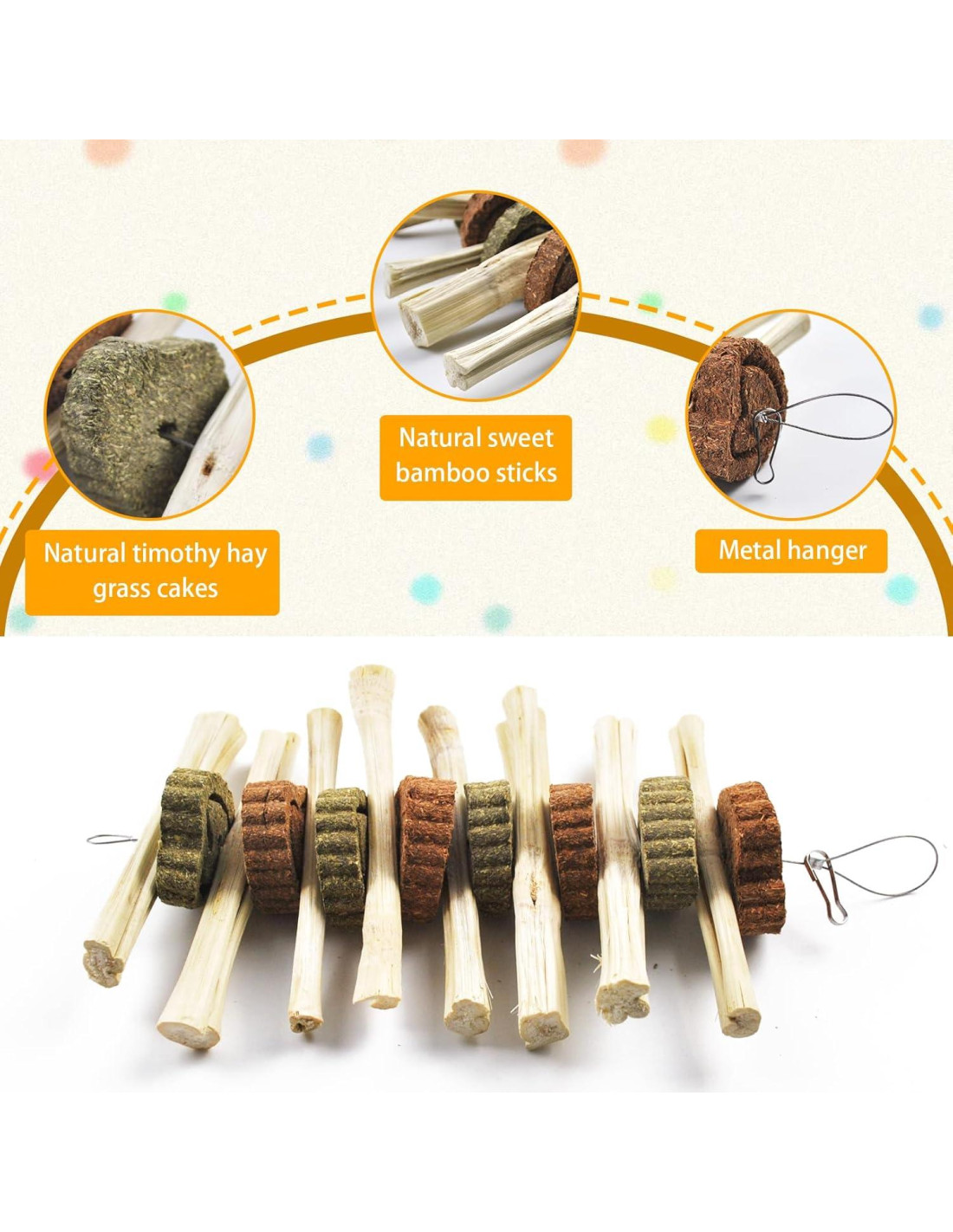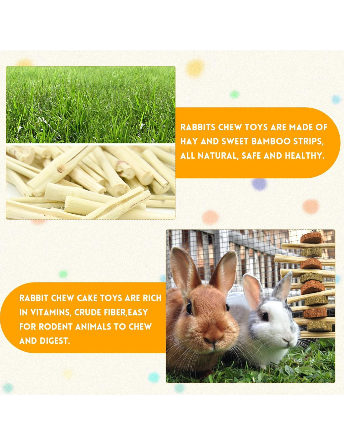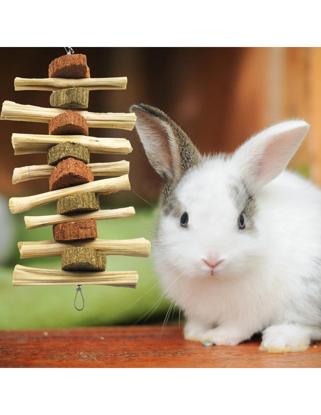 - [Snacks Naturales] Los juguetes de masticar para conejos para el desgaste de dientes incluyen palos de bambú dulces, pasteles de heno timothy y pasteles de zanahoria. Los juguetes de masticar para conejos pueden ser utilizados como un snack equilibrado y saludable para ellos.