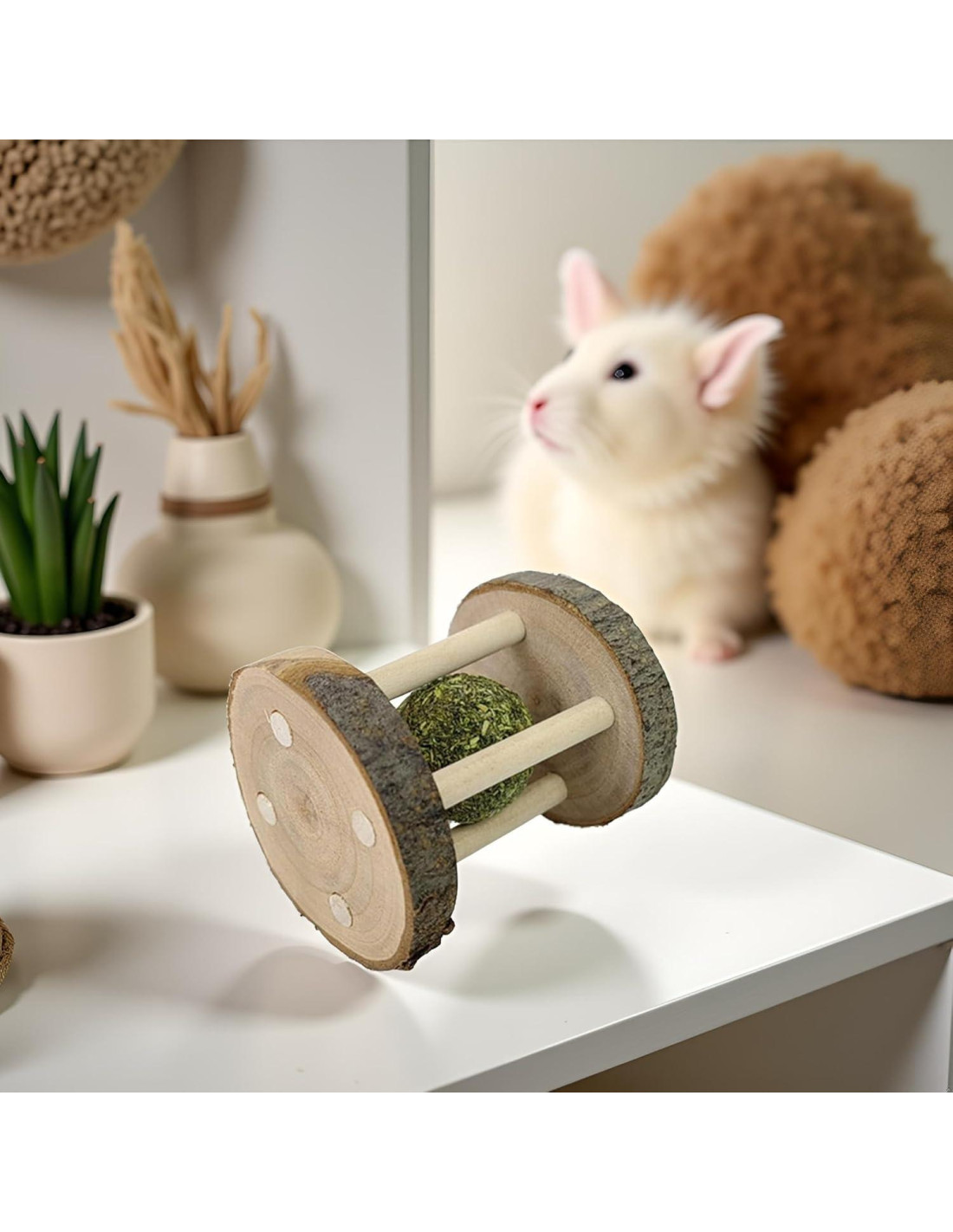 - JUGUETE PARA MASCOTAS VERSÁTIL: Juguete masticable de madera natural diseñado para múltiples mascotas pequeñas incluyendo hámsters, conejos, chinchillas, cobayas y otros animales pequeños