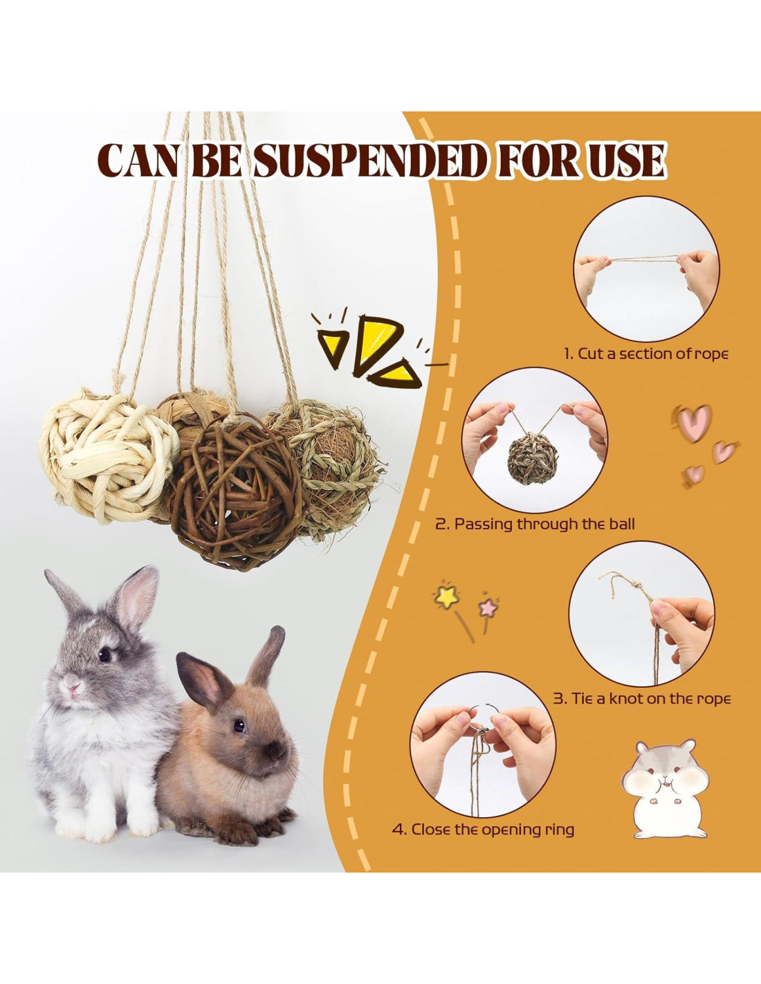 - Paquete de Valor con Beneficios para Múltiples Mascotas. Nuestro conjunto de juguetes para masticar conejos incluye 8 bolas de hierba de diferentes texturas, se pueden usar individualmente para hogares con una sola mascota o distribuir múltiples juguetes para crear estaciones de enriquecimiento para entornos con múltiples mascotas.