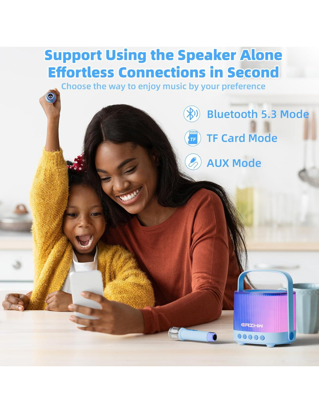 - Larga Duración de Batería: Nuestra mini máquina de karaoke cuenta con una batería de iones de litio de alta eficiencia de 1800mAh incorporada, asegurando una reproducción de música ininterrumpida de hasta 5 horas a 50% de volumen. El micrófono también cuenta con una batería de iones de litio de alta eficiencia de 600mAh incorporada. Ya sea para bailar en interiores o fiestas al aire libre, sus hijos pueden moverse libremente, lo que la convierte en una opción ideal para reuniones al aire libre, fiestas en el piso de arriba o incluso sesiones de karaoke en movimiento.