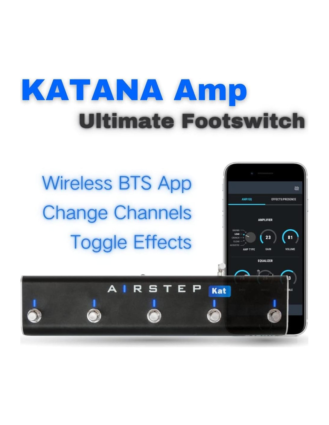 Un Controlador de Pedal que Cambia el Juego para el Amplificador KATANA. Cambia de canales sin manos, alterna efectos y cambia tipos de efectos de KATANA 50/100/Head/Artist MkII & I. Modifica el sonido del Amplificador con la App BTS para iOS y Android. ¡Sin configuración requerida, Conectar y Usar! Un cambio total para los usuarios de KATANA-50. AIRSTEP Kat tiene funciones más poderosas que el pedal BOSS GA-FC y puede funcionar simultáneamente con él si ya tienes uno. Tiene un modo adicional 'Modo de Expansión GA-FC' para compensar la falta de GA-FC. Con el AIRSTEP, finalmente puedes controlar KATANA-50 como el GA-FC y aún más, como desbloquear cinco efectos a la vez en MkI.