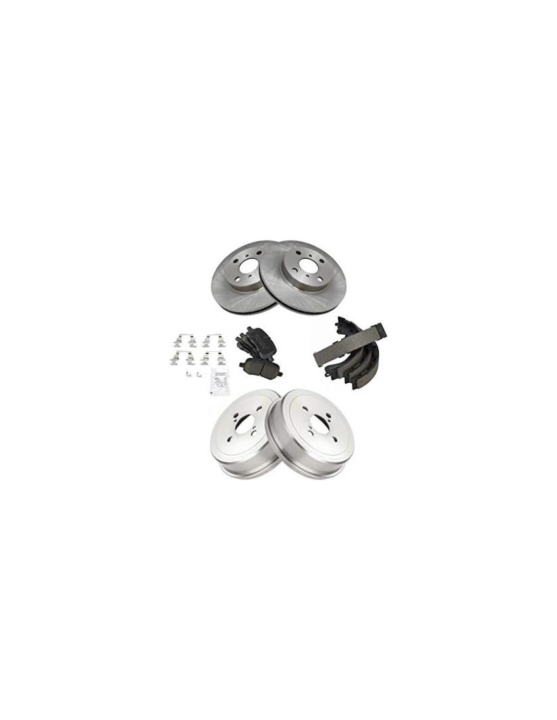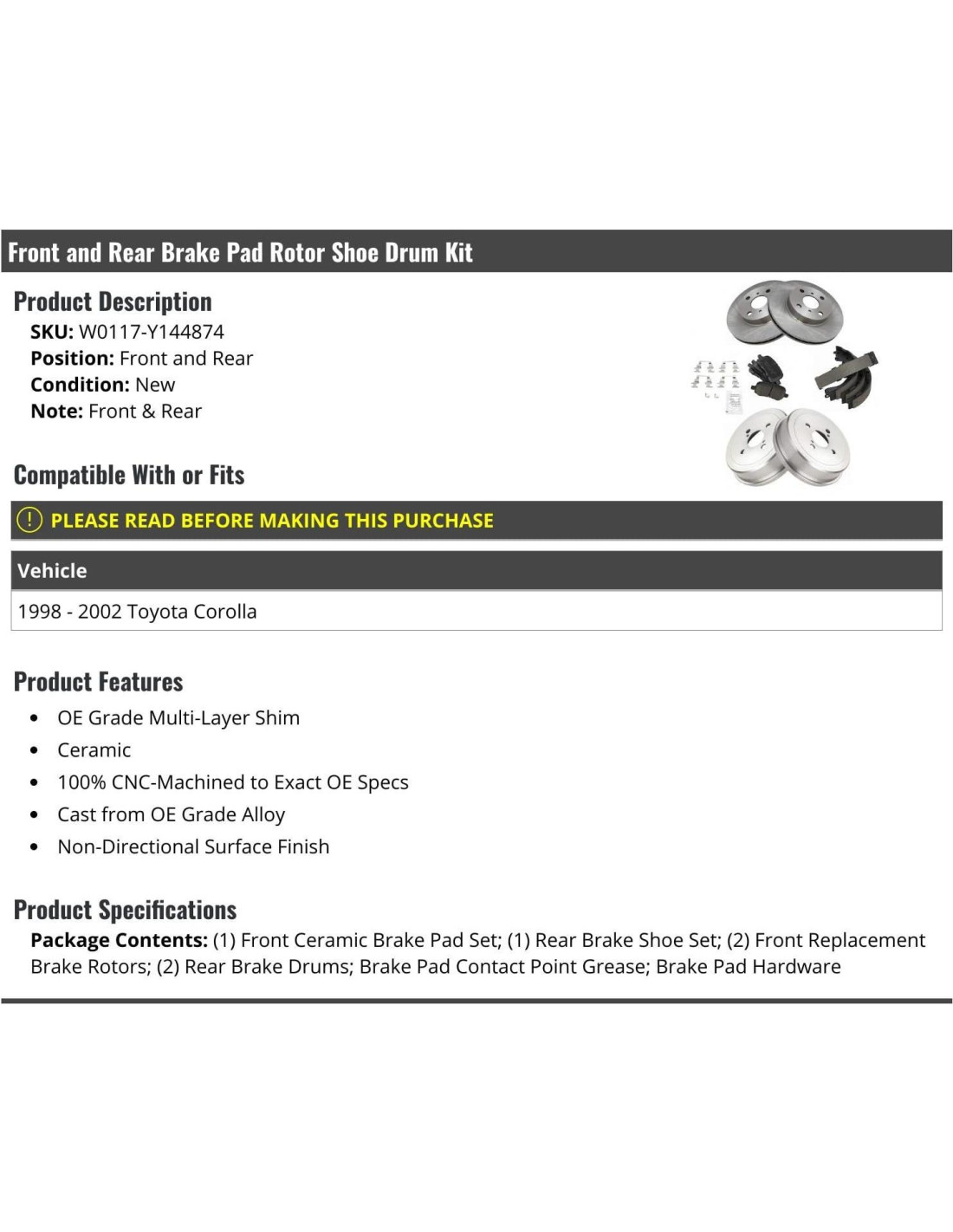Kit de 6 Piezas de Pastillas de Freno Cerámicas Delanteras y Traseras con Rotor y Tambor - Compatible con Toyota Corolla 1998 - 2002 Posición: Delante y Detrás Nota: Delante y Detrás Contenido del Paquete: (1) Juego de Pastillas de Freno Cerámicas Delanteras; (1) Juego de Zapatas de Freno Traseras; (2) Rotores de Freno de Reemplazo Delanteros; (2) Tambores de Freno Traseros; Grasa para Punto de Contacto de Pastillas de Freno; Accesorios para Pastillas de Freno Características: - Shim Multicapa de Grado OE - Cerámico - 100% Maquinado CNC a Especificaciones Exactas de OE - Fundido de Aleación de Grado OE - Acabado de Superficie No Direccional Compatible con o se Ajusta a: - Toyota Corolla 1998 - 2002