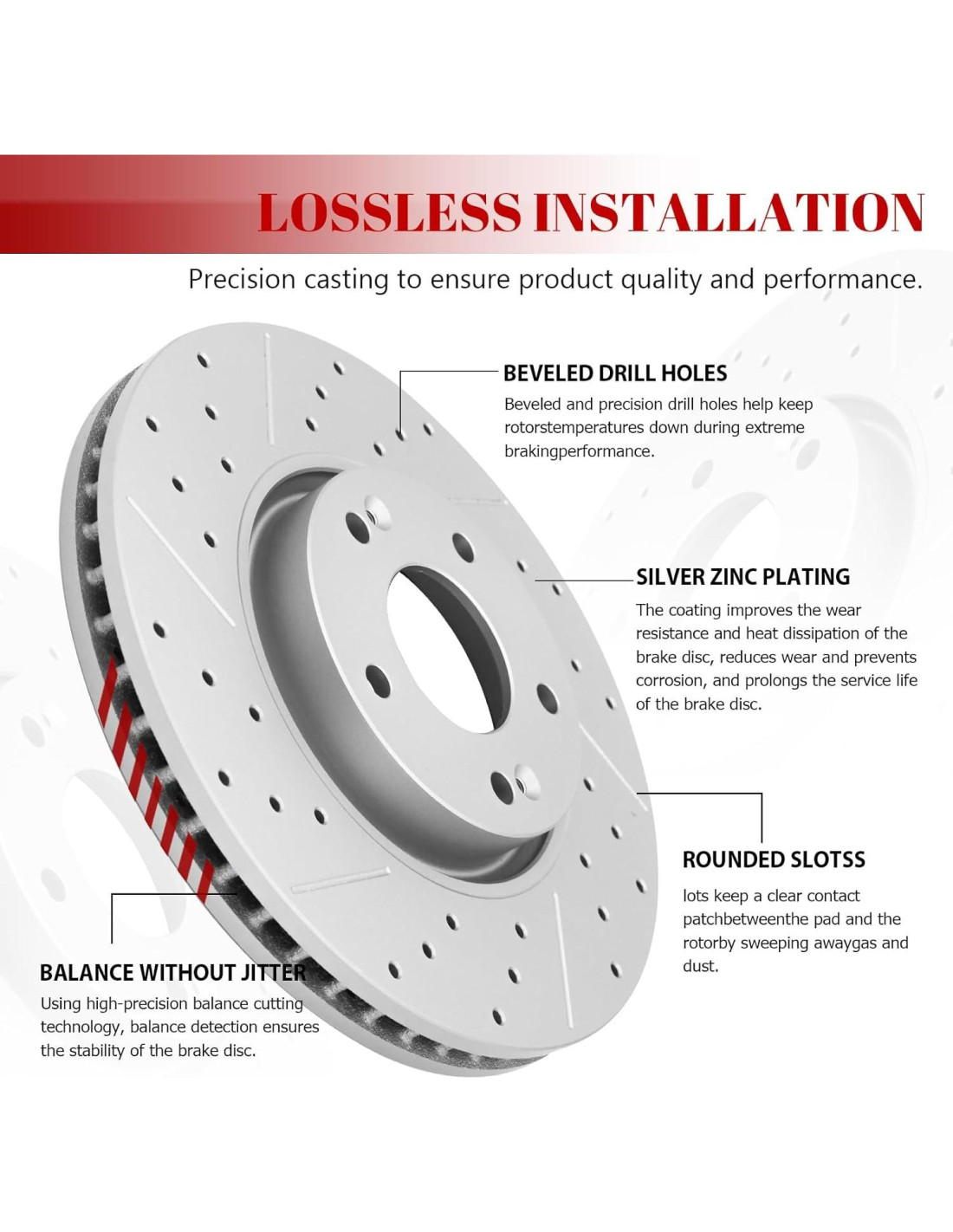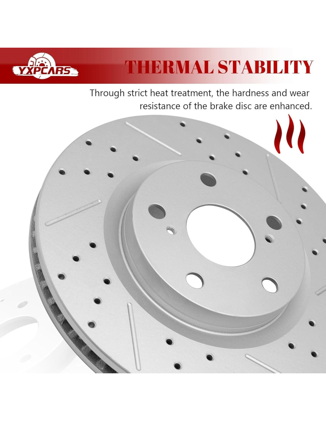 - Rendimiento de Frenado Excepcional: YXPCARS utiliza tecnología avanzada para crear una combinación de pastillas de freno cerámicas y discos perforados y ranurados con precisión. Las pastillas formuladas de manera única reaccionan rápidamente. Junto con discos recubiertos de zinc, anti-corrosión, pueden reducir la distancia de frenado hasta un 30%. Respaldado por técnicos certificados por ASE con más de 27 años de experiencia, conduce sin preocupaciones en el tráfico de la ciudad o en las autopistas