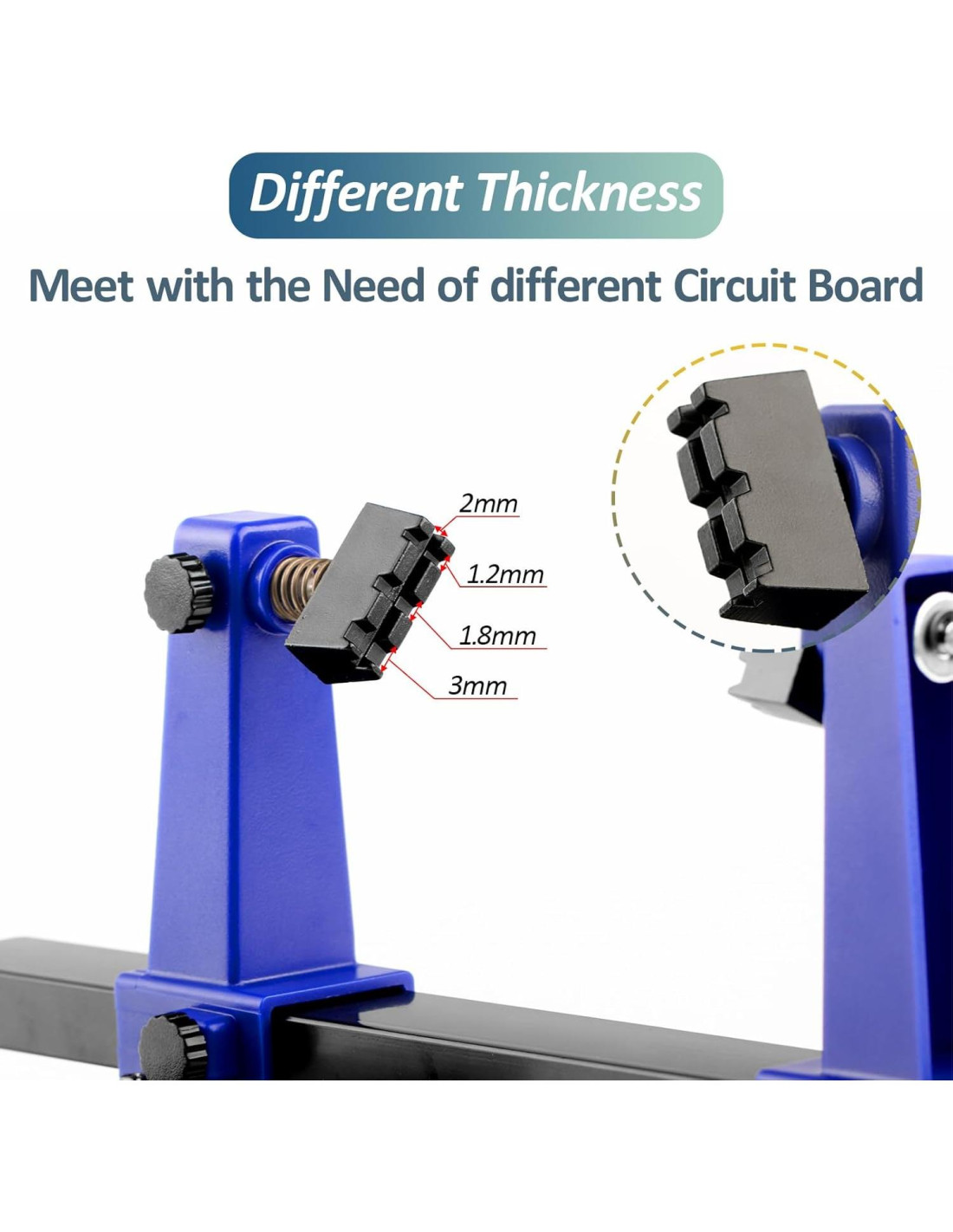 - Tamaños de placa variados: La herramienta de soldadura del soporte de PCB tiene 4 grosores diferentes: 1.2/1.8/2.0/3.0 mm, puede satisfacer la necesidad de diferentes tamaños de placa de PCB. El ancho máximo ajustable del soporte de la placa de circuito es de 200 mm, el soporte de soldadura puede ajustar el ancho según la placa de circuito diferente.