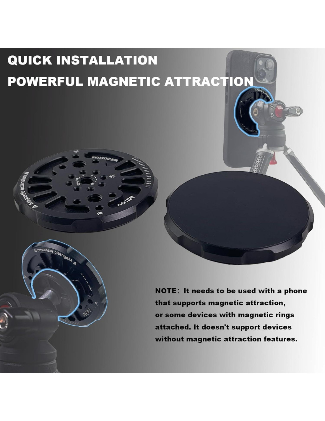 - [Ajuste Ajustado] El Montaje de Extensión Magnético FOMOZER ME60 es completamente compatible con el sistema MagSafe del iPhone y funciona sin problemas con modelos de iPhone que cuentan con MagSafe, incluyendo iPhone 16 Pro Max, iPhone 16, iPhone 15 Pro Max, 15 Plus, 14, 13, 12 Pro Max, 14 Plus, 13 y 12 mini. Es el compañero perfecto para tu blog de creación de videos. Nota: Para teléfonos no MagSafe, se requiere una funda de teléfono magnética o un anillo magnético para compatibilidad (un anillo magnético está incluido en el paquete).