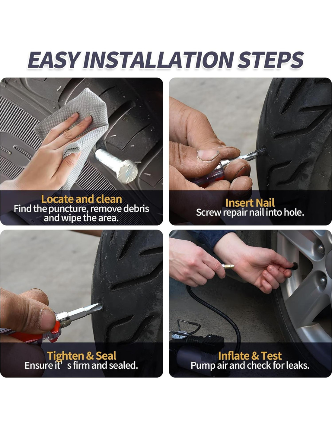 - Instalación Sin Esfuerzo para Cualquiera: Diseñados para la conveniencia del usuario, los clavos cuentan con una cabeza de punta fina para una inserción suave, roscas profundas para un mejor agarre y una cola con ranura cruzada para una fácil compatibilidad con destornilladores. No es necesario quitar el neumático; las reparaciones rápidas pueden ser completadas por profesionales o principiantes en minutos.