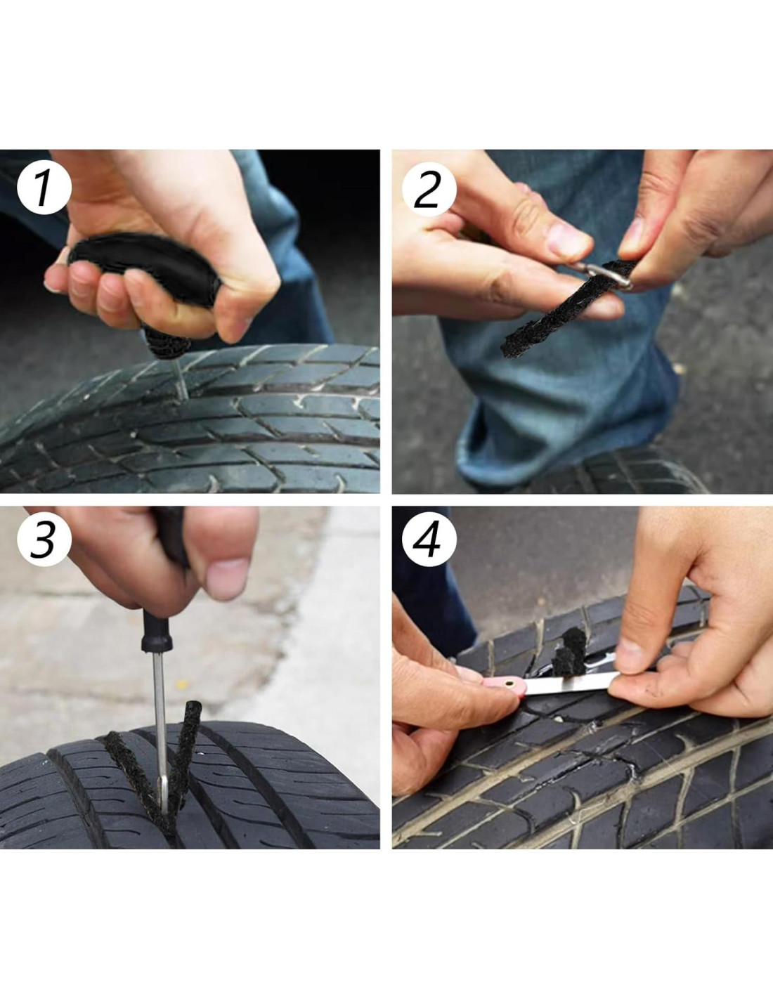 - Fácil de Usar: El tapón de reparación de neumáticos es fácil de usar, se puede reparar sin quitarlo de la llanta. Simplemente inserte los tapones para neumáticos de coches usando una herramienta (no incluida), gire lentamente, retire el tenedor y recorte.