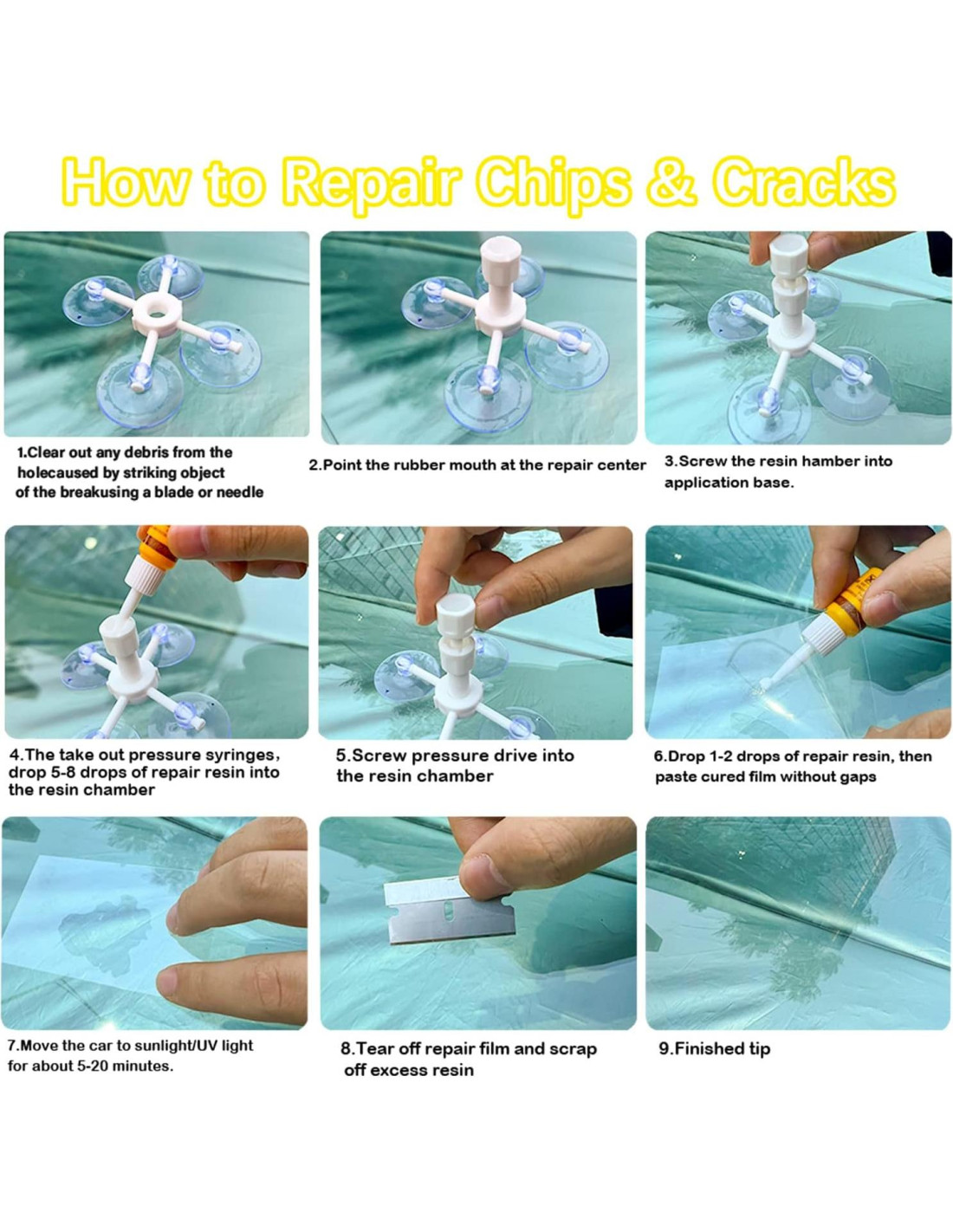- Kit de Reparación de Parabrisas Efectivo: El kit de reparación de parabrisas astillado efectivo para astillas y grietas puede ayudarle a minimizar la apariencia para lograr mejores resultados de reparación de parabrisas.