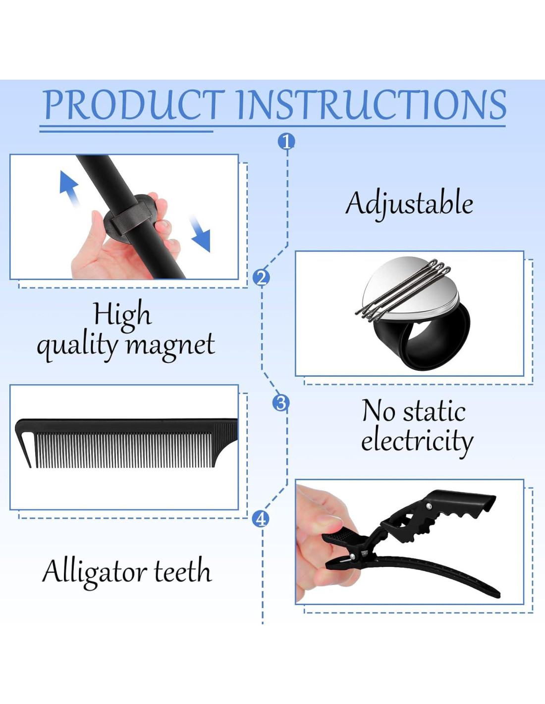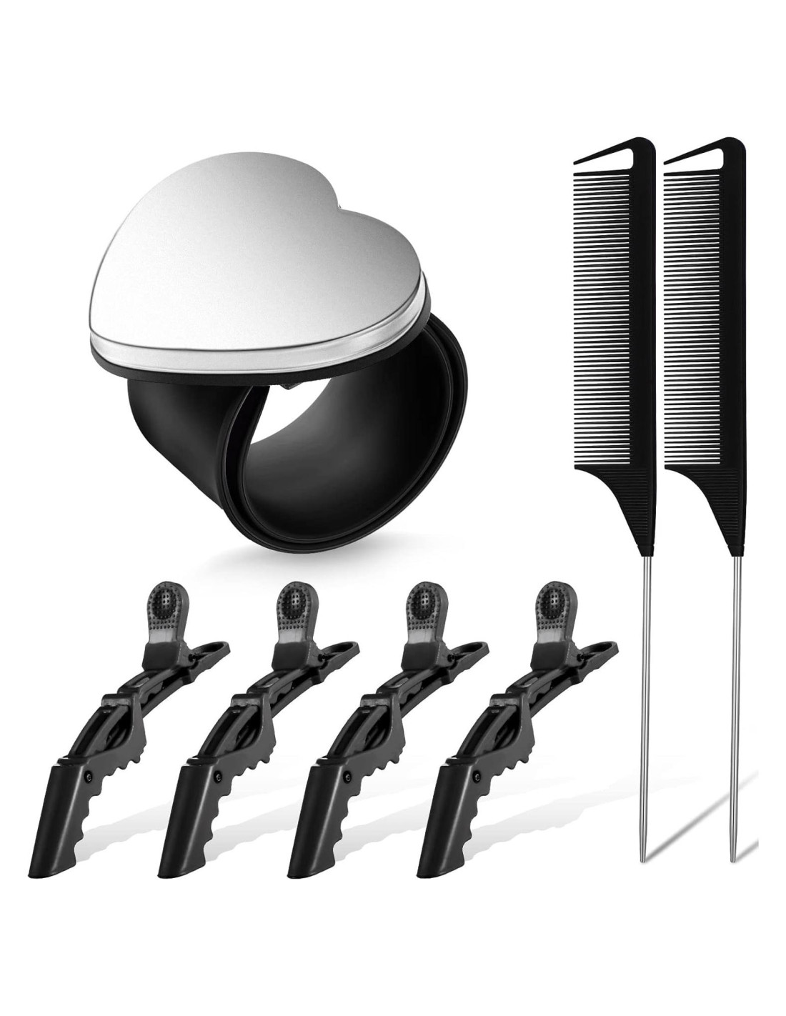 - Contenido del paquete: recibirás 1 pieza de pulsera magnética para alfileres, 2 piezas de peines de cola de rata de acero inoxidable y 4 piezas de pinzas para seccionar cabello, una buena combinación para satisfacer tus diferentes requisitos de costura de cabello en varias ocasiones