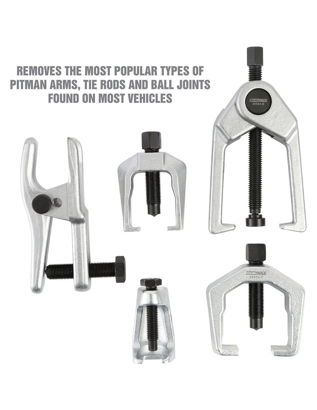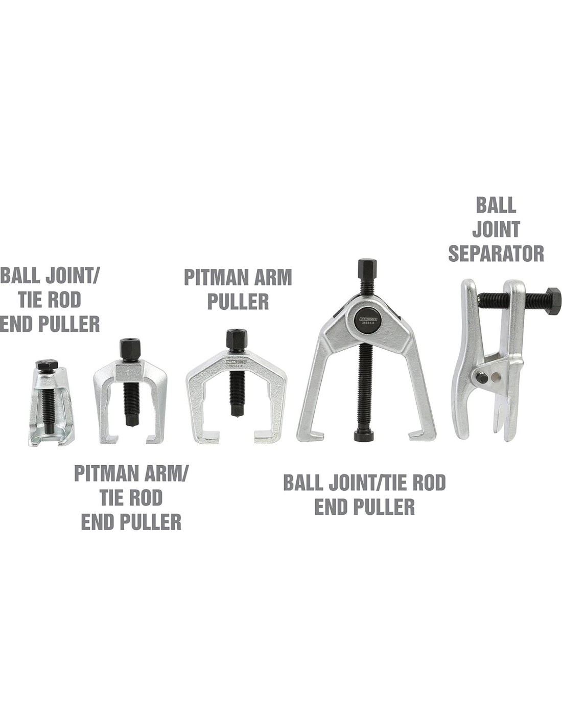 - Herramientas de Suspensión Versátiles: Realiza tareas esenciales de mantenimiento delantera con el extractor de brazo pitman, el separador de junta esférica y las herramientas de extracción de barra de dirección, facilitando el trabajo en varios sistemas de suspensión sin dañar los componentes.
