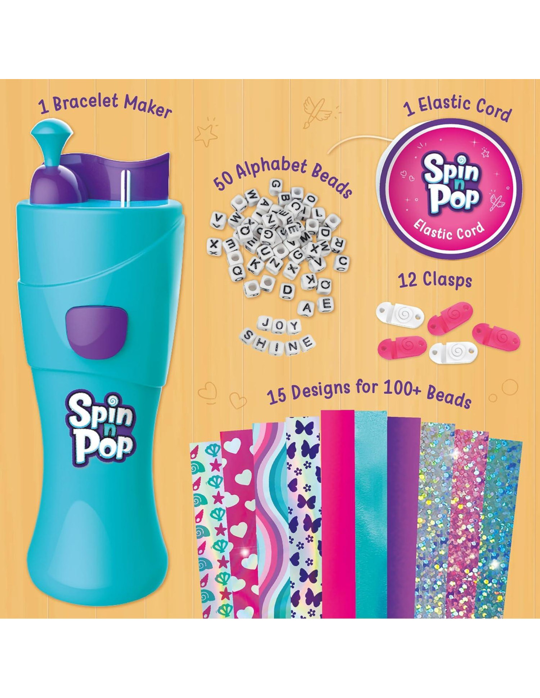 - Juego Completo de Fabricación de Pulseras Spin n Pop: ¡Todo lo que necesitas para una creatividad sin fin! Incluye 1 herramienta innovadora para hacer perlas, 15 diseños para 100 perlas brillantes, 50 perlas de alfabeto personalizables, 12 broches sin nudos, 1 cordón elástico y un manual de instrucciones fácil de seguir.