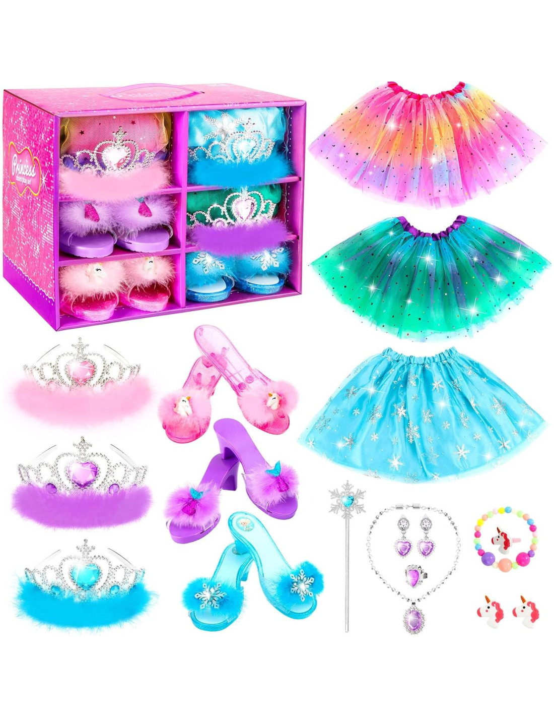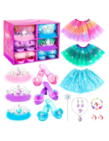 - [CONJUNTO DE DISFRAZ DE PRINCESA] Un gran éxito para tu pequeña princesa y disfruta del grito de alegría de tu niña al abrir la caja. El paquete de boutique de princesa incluye 3 pares de zapatos de tacón de princesa de tamaño para niñas pequeñas, 3 faldas coloridas, 3 coronas, 1 collar, 1 pulsera, 2 pares de aretes, 2 anillos, 1 varita mágica de princesa y una hermosa caja de regalo de almacenamiento.