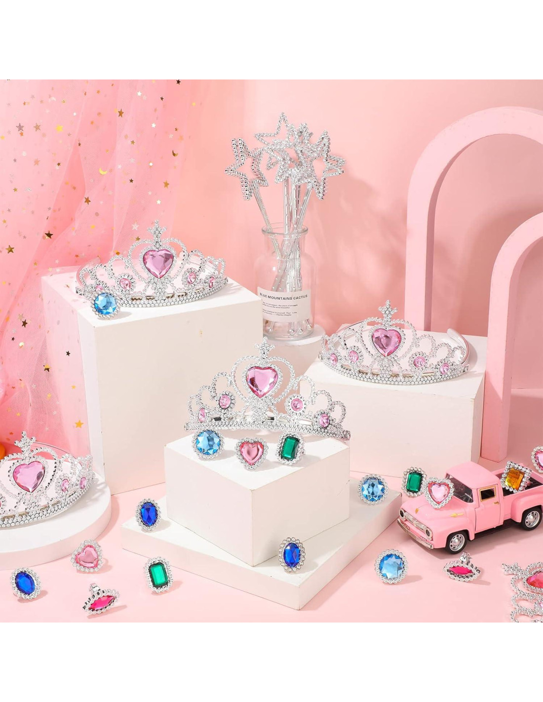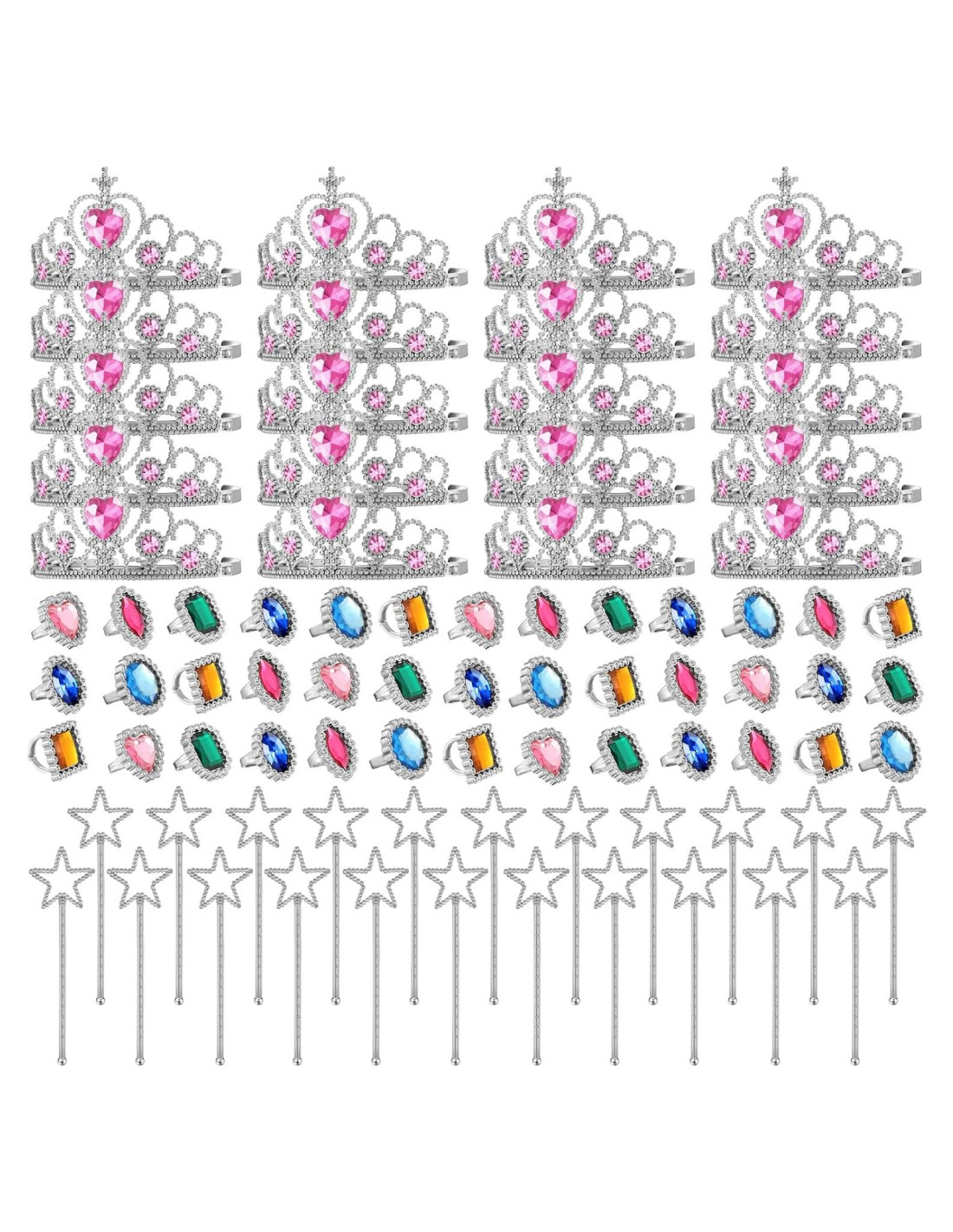 - Incluye: recibirás 24 coronas de tiara de fiesta de princesa con piedras en forma de corazón rosa, 24 varitas de estrella plateadas brillantes, 48 anillos de rhinestone de colores variados, la cantidad es suficiente para satisfacer las necesidades decorativas de tus pequeñas y ayudar a cumplir sus sueños de hacerse pasar por una princesa