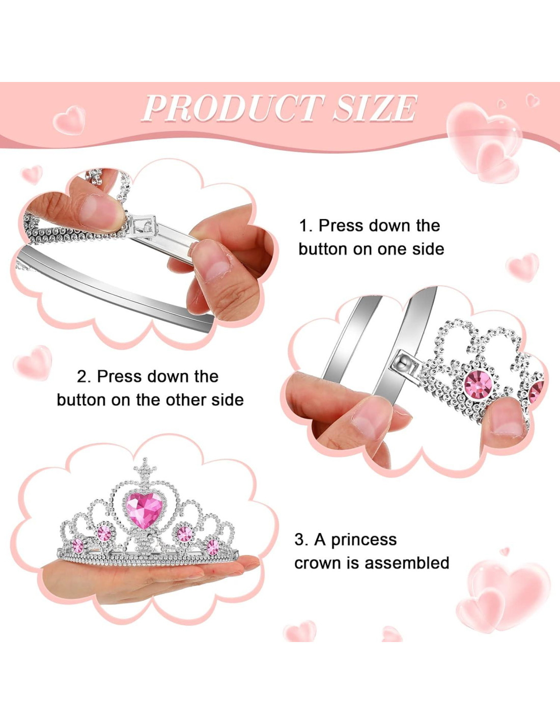 - Tamaño Adecuado: las coronas para niños tienen aproximadamente 2.87 pulgadas (7.3 cm) de altura y 5 pulgadas (12.7 cm) de diámetro, cada varita de hada para niñas mide aproximadamente 7.7 pulgadas (19.5 cm) de longitud y 2.2 pulgadas (5.5 cm) de ancho, los anillos de juego para niños son de 0.6 pulgadas (1.5 cm) de diámetro, cada anillo de joyas tiene un rhinestone de 1 pulgada (2.5 cm), adecuado para que la mayoría de las pequeñas niñas lo usen