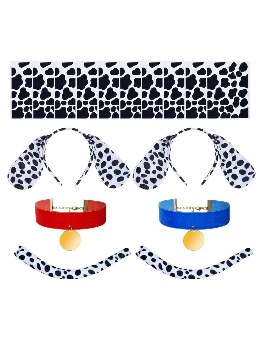 - 2 Conjuntos de Disfraz de Dálmata: El paquete incluye 2 diademas de orejas de dálmata, 1 gargantilla de terciopelo rojo, 1 gargantilla de terciopelo azul, 2 colas de dálmata, 10 hojas de stickers negros. combinación completa para disfraz de dálmata de 101 días de escuela para adultos.