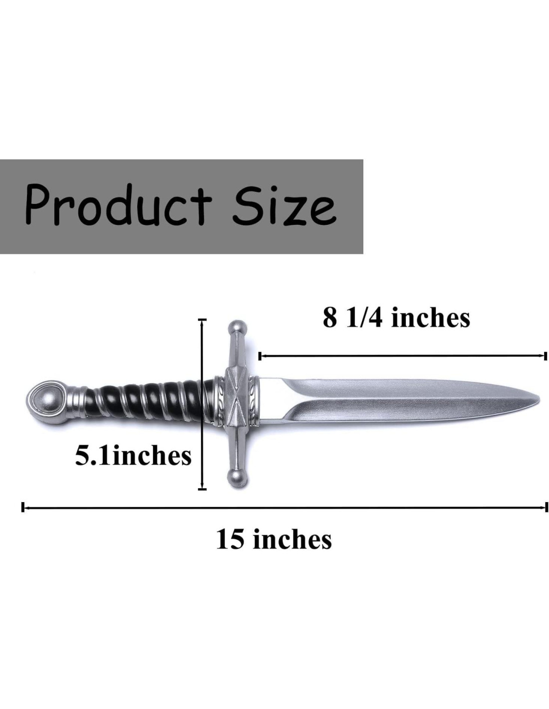 - Mide 15 pulgadas (38,1 cm) en total con una hoja de 8 1/4 pulgadas (20,96 cm), y el peso de la daga es 0.18 lb (0,08 kg), una talla que se adapta a todas las edades.