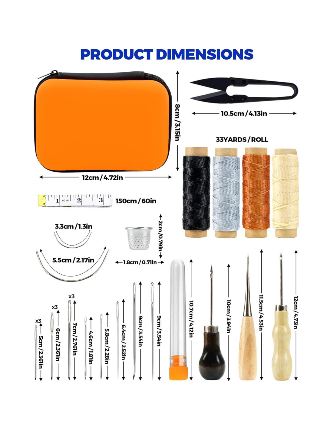 - [Kit Completo de Herramientas de Costura de Cuero] 31 piezas incluye 4 x hilo encerado (30m/rollo), 7 x agujas de coser a mano de alta resistencia, 9 x agujas de coser de ojo grande con 1 x botella de almacenamiento (tres de cada tamaño), 3 x awls de costura, 2 x protectores de dedos, 1 x dedal, 1 x cinta métrica flexible, 1 x tijeras para hilo, 1 x estuche de almacenamiento con cremallera. Disfruta de una costura fácil como un sastre profesional con nuestro juego de herramientas de trabajo en cuero de tamaño de viaje que contiene todos los elementos esenciales de costura por si acaso.