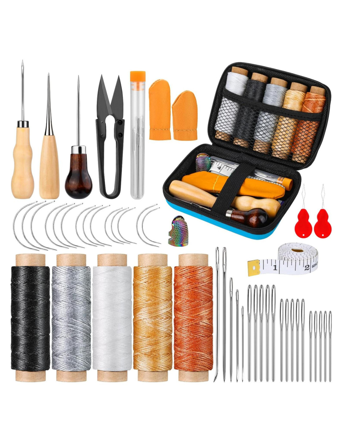 - Kit de Reparación de Tapicería El kit de agujas e hilo contiene 34 pcs agujas de costura de cuero para coser a mano, 5 pcs hilo de tapicería encerado, 3 pcs awl de costura, 2 pcs enhebradores de agujas, cinta métrica, dedal, tijeras, dedales, bolsa de almacenamiento del kit de costura, etc. Herramientas de costura de tapicería de cuero compactas vienen en una gama completa de tamaños para satisfacer tus necesidades básicas de costura de cuero
