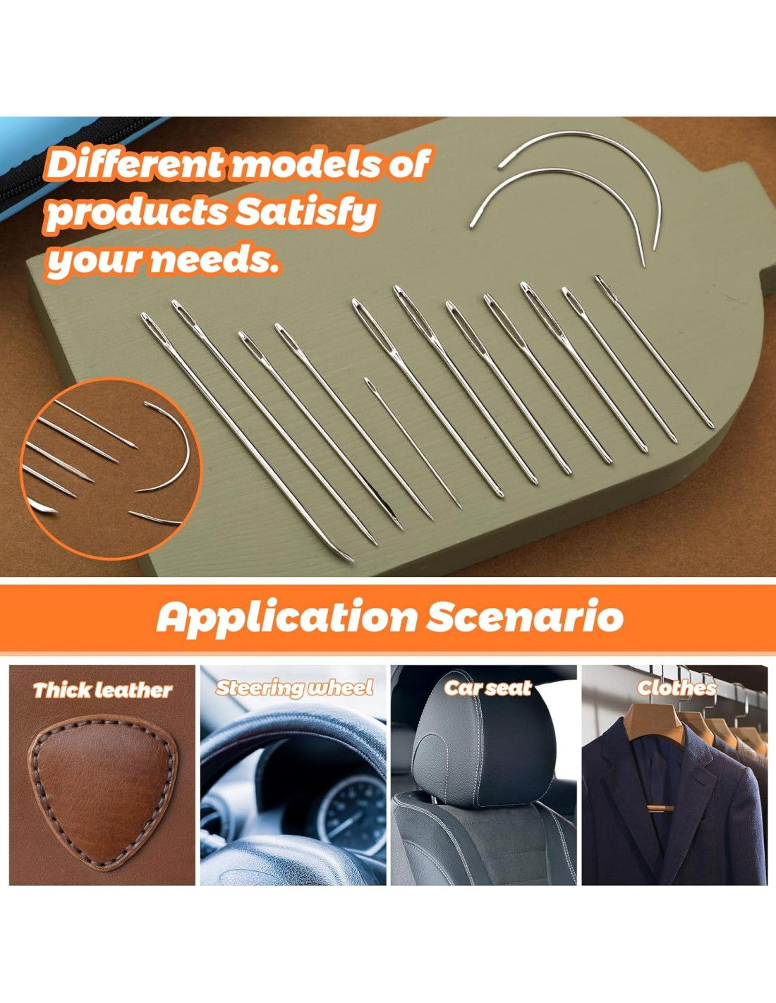 - 34 Pcs Agujas de Costura para Coser a Mano Un kit de costura de tapicería de alta resistencia completo con las necesidades que necesitarás para comenzar reparaciones de cuero. Agujas de tapicería de cuero de alta calidad para coser a mano, aguja curva, hilo de tapicería, tijeras, un dedal, etc. Si prefieres hacer la reparación tú mismo para reemplazar artículos con daños menores, este es el kit de costura de cuero para ti