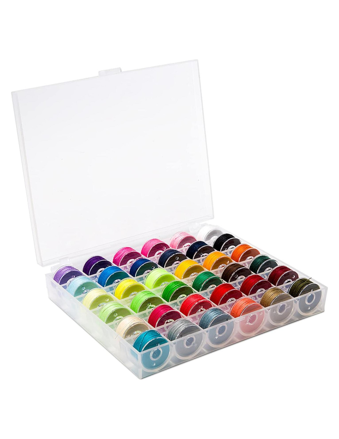 - MANTEN LA ORGANIZACIÓN DE LAS BOBINAS: Viene con una caja de bobinas transparente que tiene cada bobina en un lugar separado, lo que es muy organizado. Hecho de plástico con vista clara, es fácil ver qué color elegir y permite que tu costura a mano sea de manera ordenada