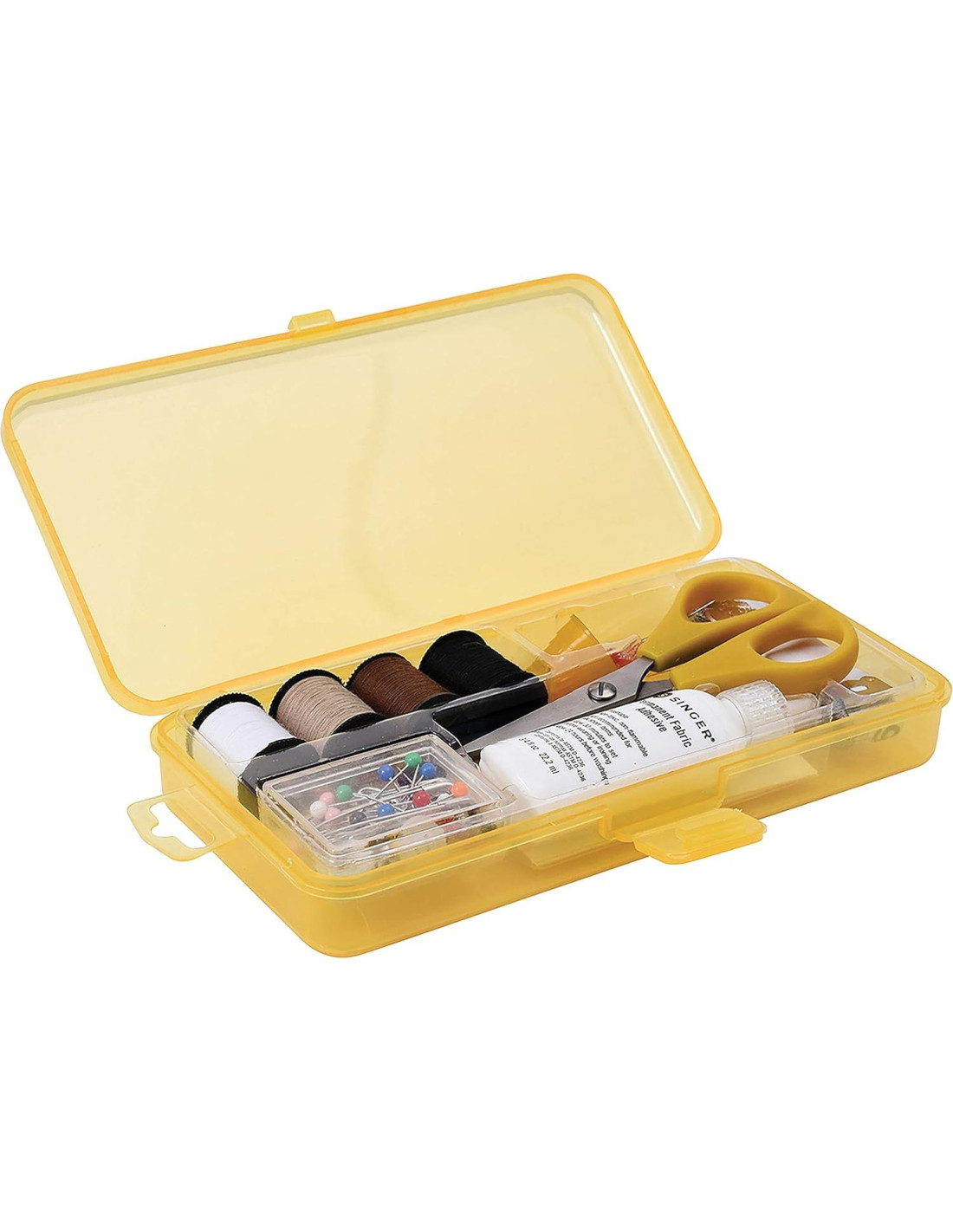- Incluye tijeras, cinta, pegamento para tela, cinta métrica, lápices para marcar, hilo, agujas, enhebrador de agujas, dedal, alfileres, alfileres de seguridad y botones