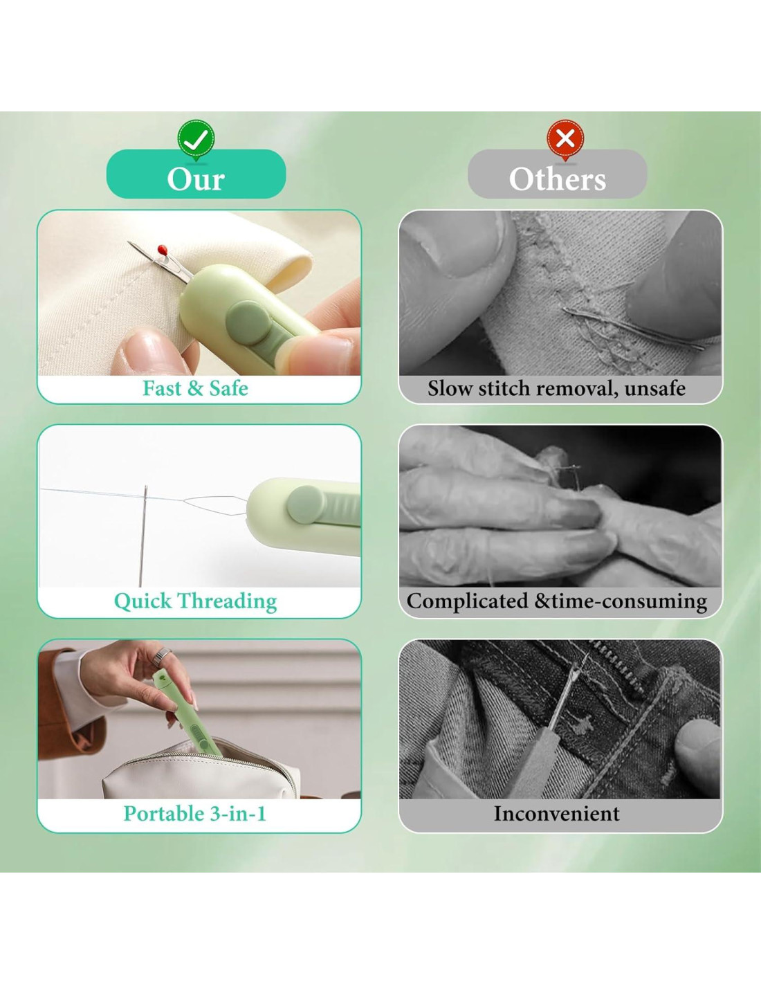 - Duradero y Preciso: Fabricado con materiales resistentes, nuestro enhebrador de descoser mejorado 2 en 1 asegura operaciones sin problemas y correcciones de costura precisas. Diseñado para la durabilidad, soporta el desgaste diario, garantizando fiabilidad duradera para todos los proyectos de costura