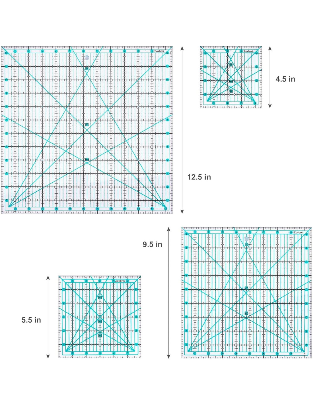 - Regla de Acolchado Cuadrada: Hay 4 reglas de acolchado acrílicas cuadradas, tamaños: 4.5"x4.5" (11.43 cm x 11.43 cm), 5.5"x5.5" (13.97 cm x 13.97 cm), 9.5"x9.5" (24.13 cm x 24.13 cm), 12.5"x12.5" (31.75 cm x 31.75 cm). La combinación de múltiples tamaños satisface los diferentes requisitos de escena desde el corte de pequeños retazos hasta la posición de telas de gran formato. Ya sea haciendo bolsillos, uniendo patrones o haciendo una camiseta o colcha completa, puedes encontrar el tamaño adecuado.