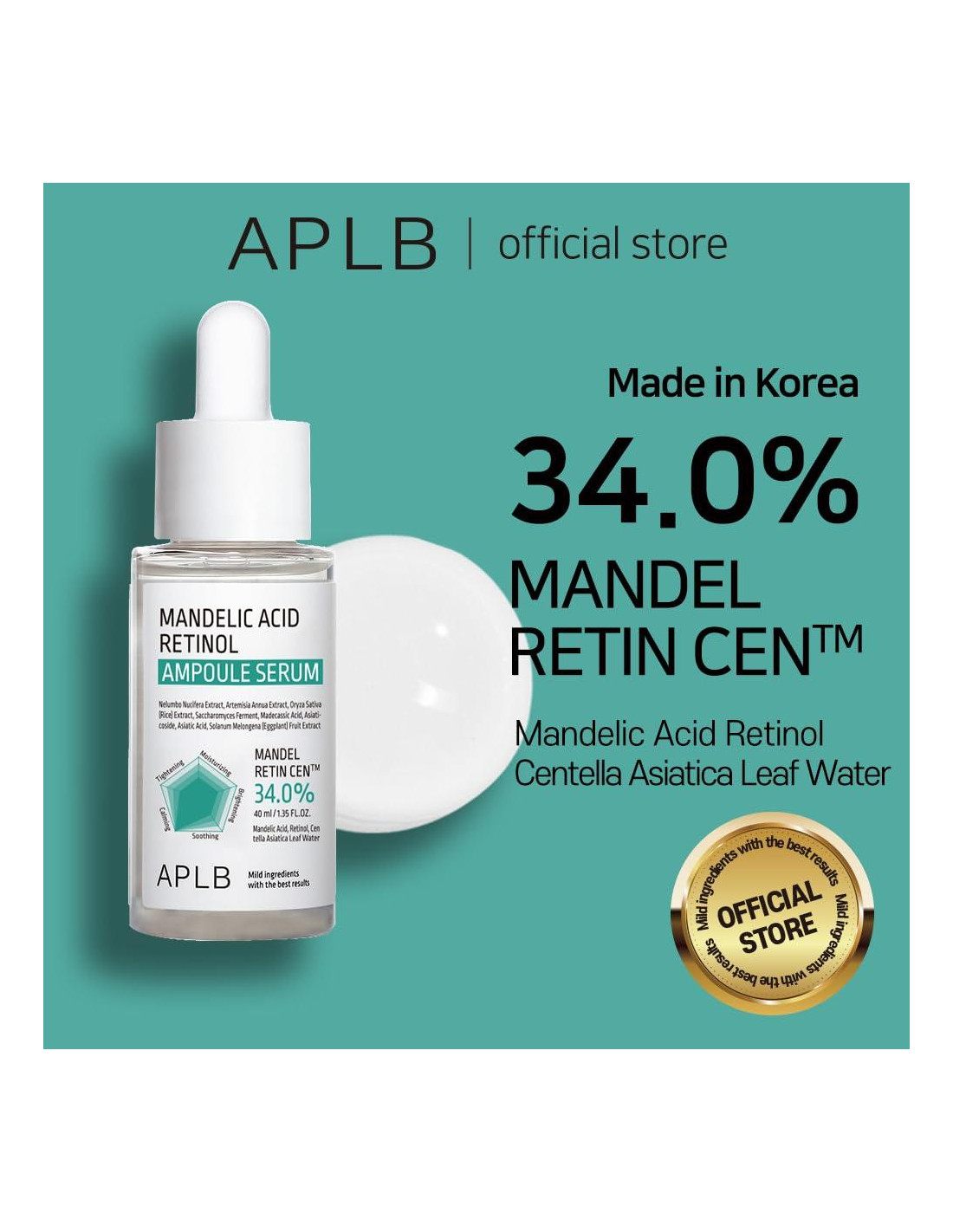 - RESUMEN BÁSICO: Suero Ampoule de Ácido Mandélico y Retinol | MANDEL RETIN CEN 34.0% (Ácido Mandélico, Retinol, Agua de Hoja de Centella Asiática), combinado con Complejo Centella 3x