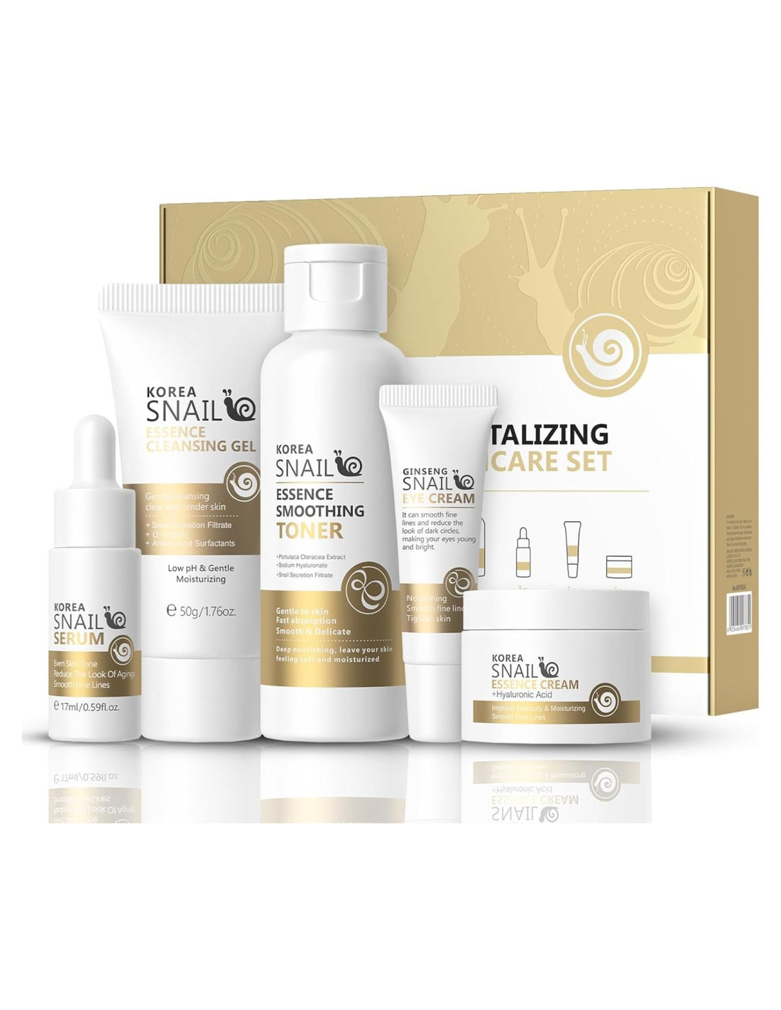 - [JUEGO DE CUIDADO DE PIEL DE CARACOL COREANO 5-PIEZAS] - El kit de cuidado de piel de caracol coreano tiene todas tus necesidades hidratantes favoritas: incluyendo 50g de limpiador, 100ml de tónico, 17ml de suero facial, 25g de crema facial y 15g de crema para ojos, dejando tu piel suave y vibrante desde el primer cuidado de piel.