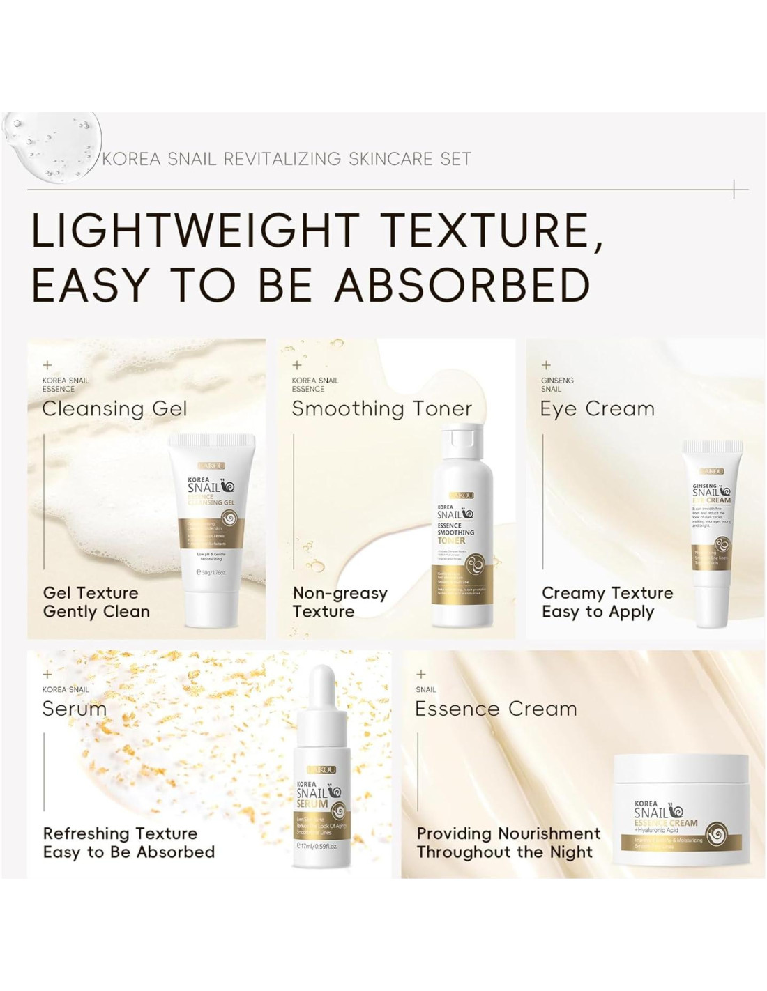- [KIT DE CUIDADO DE PIEL DIARIO] - Este juego y kit de cuidado de piel facial de caracol es ligero y la esencia hidratante de caracol puede ser rápidamente absorbida por la piel, fórmula ligera con textura suave, no pegajosa. Kit de rutina de cuidado de piel para mujeres y niñas para satisfacer todas tus necesidades diarias de cuidado de piel.