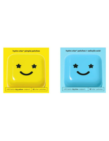 - 2. HYDRO-STARS + AZUL GRANDE: Un compacto reutilizable lleno de 32 parches Hydro-Star + Ácido Salicílico. Hechos con hidrocoloide y 1% de ácido salicílico para ayudar a disolver las células muertas de la piel y destapar los poros.