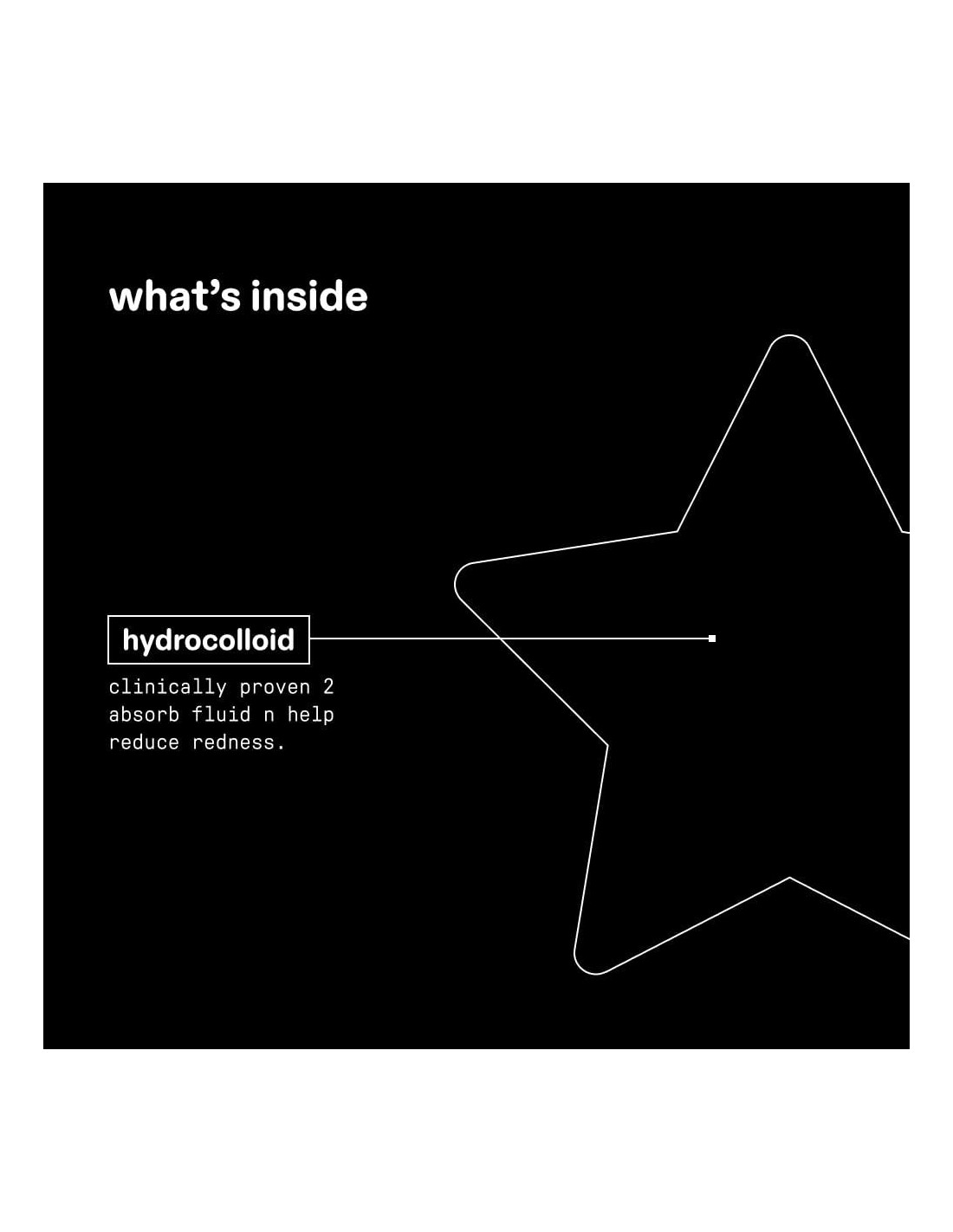 - 1. HYDRO-STARS + GRAN AMARILLO: Un compacto reutilizable lleno de 32 parches para espinillas en forma de estrella. Los Hydro-Stars están hechos con 100% hidrocoloide para ayudar a absorber fluidos, reducir el enrojecimiento y disminuir las manchas mientras lucen lindos.