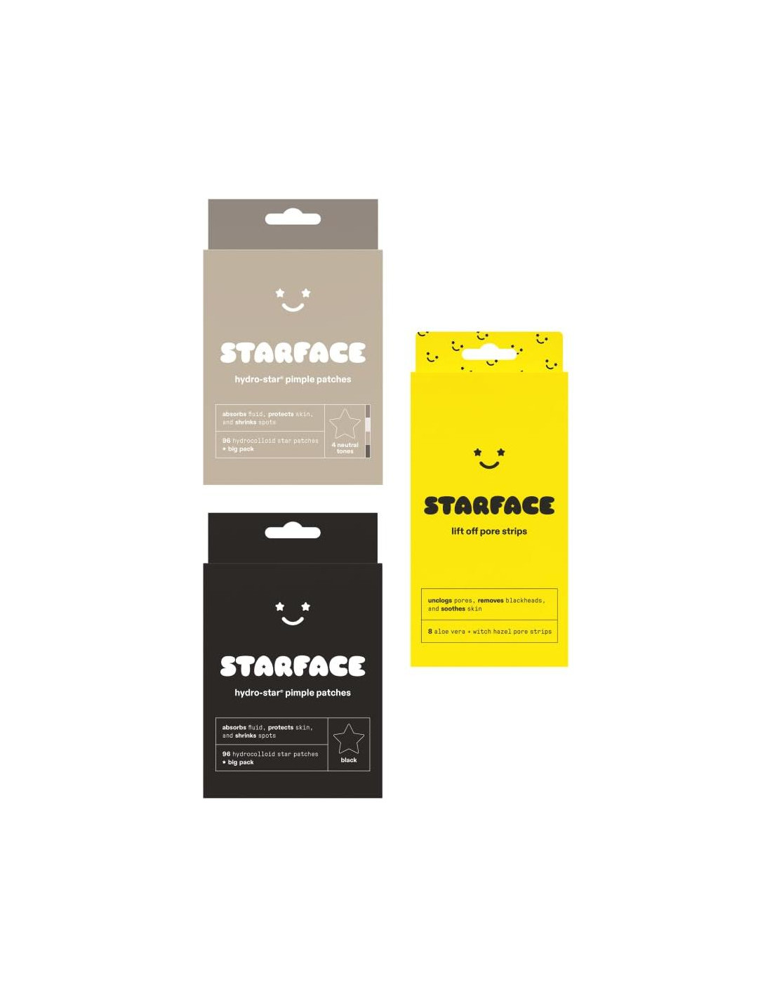 - PAQUETE STARFACE: Mantén la piel linda y feliz con tres favoritos de Starface: parches para espinillas Estrella Negra, tiras para poros Lift Off y parches para espinillas Estrella de la Tierra.