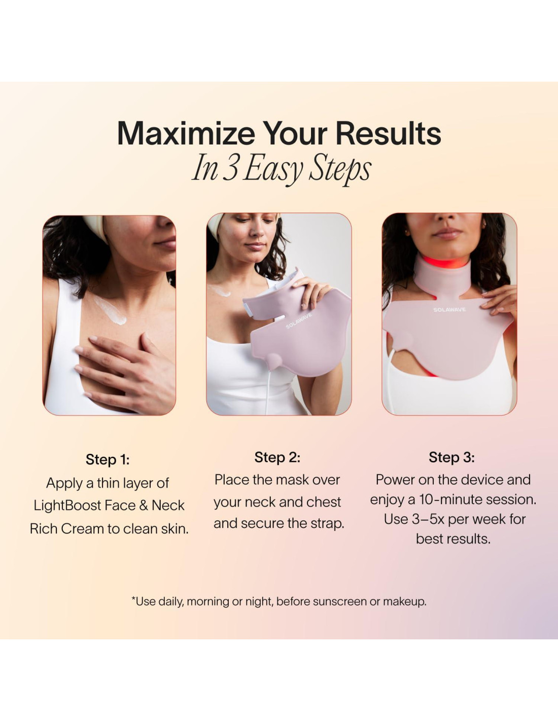 La delicada piel de tu cuello y pecho es una de las primeras áreas en mostrar signos visibles de envejecimiento. Este dúo respaldado por expertos está diseñado para ayudar. La Máscara para Cuello y Pecho Solawave utiliza dos terapias de luz, Luz Roja (630nm) y Luz Infrarroja Cercana (830nm), para reducir visiblemente las líneas finas, suavizar pliegues, desvanecer la decoloración y promover una apariencia más firme y levantada en solo 10 minutos al día. Hecha con silicona de grado médico, la máscara aprobada por la FDA se ajusta cómodamente contra la piel para un tratamiento sin manos y no invasivo que apoya la producción de colágeno y ayuda a mejorar la luminosidad de la piel con el tiempo. Combínala con la Crema Rica LightBoost para la Cara y el Cuello, una fórmula profundamente nutritiva que ha demostrado potenciar los efectos de la terapia de luz roja. Este lujoso humectante cuenta con Multi Péptidos, Colágeno Vegano y Pro-Vitamina D para hidratar, apoyar la fuerza de la barrera y levantar y reafirmar visiblemente. Los Ceramidas y el Ácido Tranexámico apoyan aún más una apariencia más suave y de tono más uniforme. Juntos, este kit ayuda a abordar la flacidez, la textura irregular y la opacidad, haciendo que el cuidado profesional del cuello y el pecho sea una parte sin esfuerzo de tu rutina diaria de cuidado de la piel.