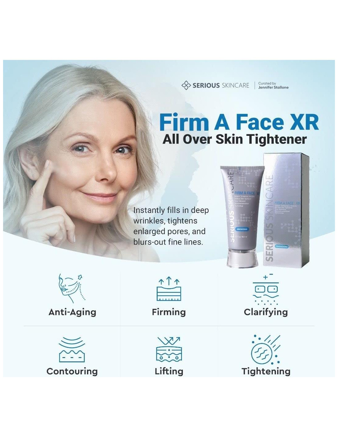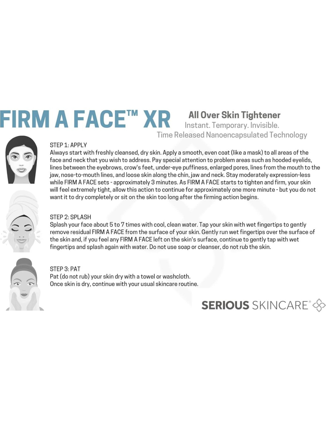 ARRUGAS PROFUNDAS, LÍNEAS FINAS y POROS AGRANDADOS son alisados y difuminados para redefinir el cutis. Tu cara aparece tonificada, más firme y con una apariencia más juvenil. Redefine todo el cutis con solo un tratamiento. Ve y siente los resultados en tres minutos. Nuestra tecnología nano-encapsulada trabaja desde el interior, rellenando y alisando todas las imperfecciones visibles de la piel. ARRUGAS PROFUNDAS - LÍNEAS FINAS y POROS AGRANDADOS son alisados y difuminados para redefinir el cutis. Tu cara aparece tonificada, más firme y con una apariencia más juvenil. El Retinol nano-encapsulado de liberación temporal se hunde profundamente en las imperfecciones de la piel, rellenando arrugas profundas, alisando líneas finas y apretando poros agrandados. Las propiedades de microcirculación localizadas de la cafeína ayudan a descongestionar los poros y reducir la hinchazón de las bolsas debajo de los ojos. FIRM A FACE XR, el apretador temporal de piel, se puede usar a diario como parte de tu régimen de cuidado de la piel para lograr un levantamiento temporal. Apto para mujeres y hombres. Reduce la apariencia de líneas y arrugas. Reduce y aprieta los poros. Proporciona efectos de acción rápida y duraderos. Descongestiona la hinchazón debajo de los ojos. FIRM A FACE XR es un apretador de piel TOTAL, reductor de poros y descongestionante de ojos. Insta-Tox es un reductor de arrugas DIRIGIDO. FIRM A FACE XR proporciona un sutil efecto de apretado total y Insta-Tox afecta áreas más pequeñas y específicas de manera más intensa. Para un efecto de firmeza más intenso, prueba mezclar un poco de FIRM A FACE XR en tu crema facial favorita, mezcla en la palma de tu mano, aplica en toda la cara (y el cuello si lo deseas) y deja en la piel. La proporción de FIRM A FACE XR a crema facial se puede ajustar dependiendo del efecto de firmeza que desees. Sí, después de que el FIRM A FACE XR se enjuague y la piel se seque, puedes continuar con tu rutina habitual. Recuerda, cada vez que apliques hidratación, humectación o una base líquida, puedes sentir que la firmeza del FIRM A FACE XR se libera; esta es una liberación temporal, ya que la piel absorbe la capa extra de humedad y se seca, el FIRM A FACE XR se reactivará y la piel se volverá a apretar. No, no has hecho nada mal. Una vez que la capa superficial de FIRM A FACE XR se enjuaga de la piel, la intensa firmeza superficial se libera. A medida que la piel se seca, sentirás que el FIRM A FACE XR comienza a reactivarse dentro de la piel, y se sentirá una sutil firmeza total.