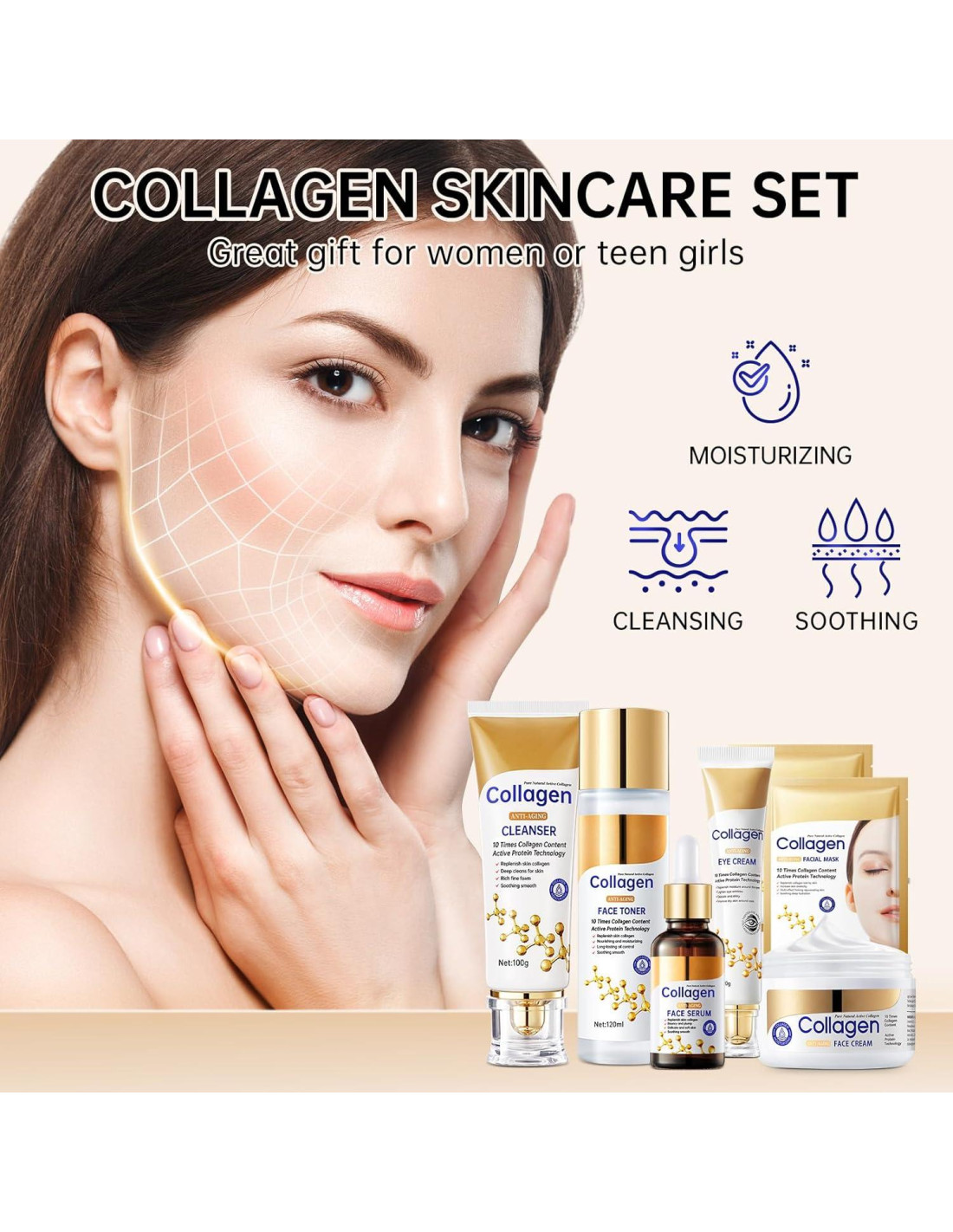- Conjunto de Cuidado de Piel con Colágeno: Nuestro conjunto de cuidado de piel enriquecido con ingredientes de colágeno, que hidratan tu piel, reponen tu piel con colágeno y agua. También restaura la elasticidad y vitalidad de la piel, haciéndola más hidratada y suave