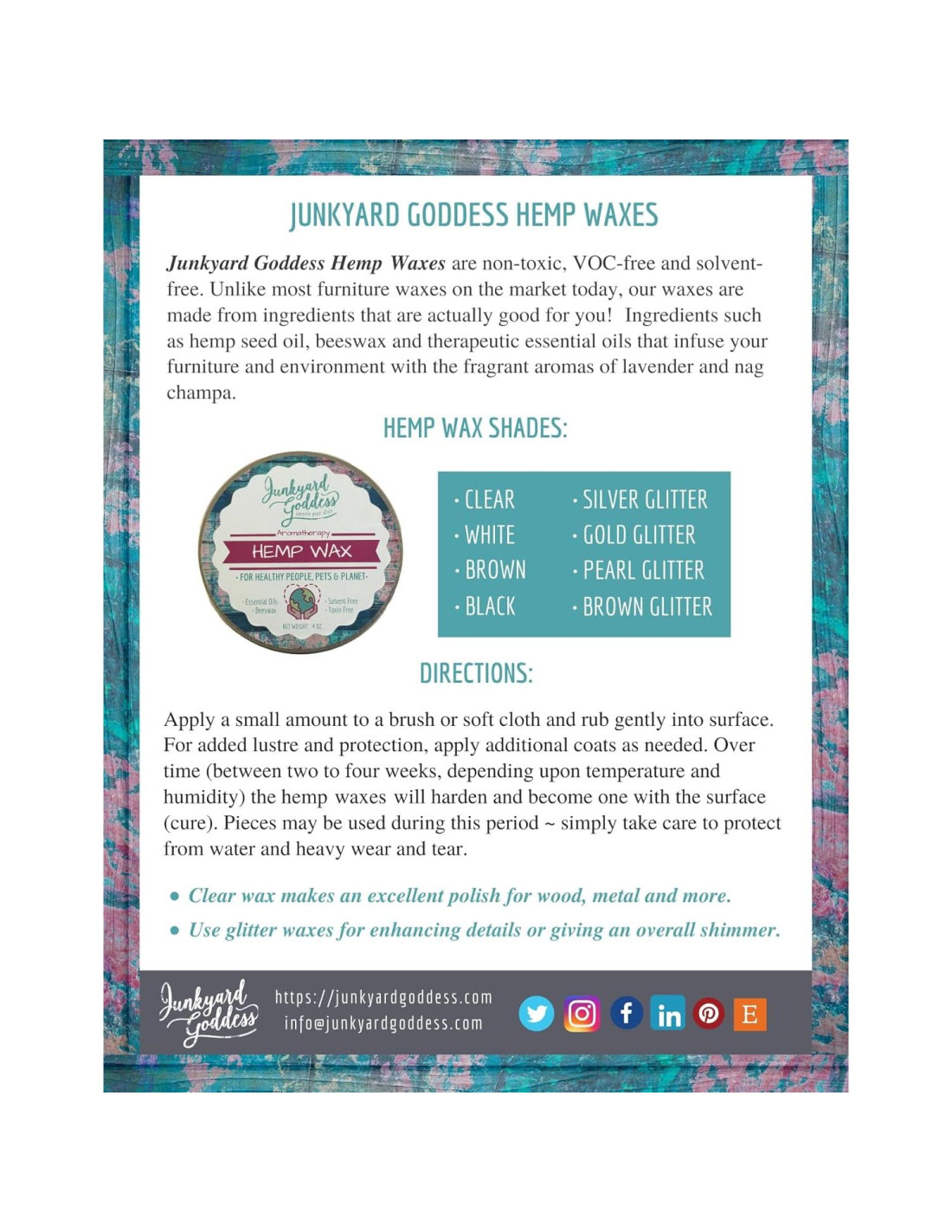 Desata tu rebelde interior con la Pintura de Leche Junkyard Goddess, Aceite de Cáñamo y Ceritas de Cáñamo. Transforma tu espacio en un paraíso rudo con nuestros productos vanguardistas, seguros para el medio ambiente y sostenibles. Sé audaz. Abraza a la diosa que hay en ti. Eleva tu estilo con Junkyard Goddess. Refresca tu hogar con la belleza natural de las Ceritas de Cáñamo Junkyard Goddess. Experimenta la magia de nuestras ceras claras 100% derivadas de la naturaleza en fragancias de Nag Champa, Lavanda y Creamsicle (Naranja/Vainilla), mientras rejuvenecen y realzan la apariencia de tus piezas queridas. Renueva tus viejos muebles y gabinetes en impresionantes obras de arte con estas ceras aromáticas transformadoras. Observa cómo tus piezas cobran vida con un nuevo aspecto fresco. ¡Sé creativo y desata tu artista interior hoy! Haz un impacto positivo en el planeta con nuestros productos. Únete a nosotros en nuestra misión de ser administradores responsables de la tierra eligiendo productos que valoren un planeta más limpio y seguro para todos. ¡Juntos, creemos un futuro más verde! Deja los productos químicos agresivos a otros y logra un aspecto impresionante con el acabado premium de nuestras Ceritas de Cáñamo Junkyard Goddess 100% derivadas de la naturaleza. Ofreciendo un hermoso brillo y un acabado mate resistente al agua, nuestras ceras de acabado y pulidores de muebles realzan el color, nutren y protegen una variedad de superficies. Mantén tu hogar luciendo impecable con nuestra cera de acabado multipropósito y pulidor de muebles. Ya sea madera cruda, metal, piedra, cuero, proyectos de pintura de leche o tiza, nuestras Ceritas de Cáñamo Junkyard Goddess te tienen cubierto. Mejora y protege tus piezas favoritas sin esfuerzo y de manera sencilla. ¿Buscas una forma segura y respetuosa con el medio ambiente para refrescar tu espacio? Las Ceritas de Cáñamo Junkyard Goddess son libres de solventes, libres de petroquímicos, libres de COV y seguras para alimentos. ¡Di adiós a los productos químicos agresivos! Úsalas en interiores con las ventanas cerradas para una experiencia totalmente segura y aromática. Mejora tu entorno con las Ceritas de Cáñamo Junkyard Goddess. Infundidas con aceites esenciales como lavanda, sándalo y mandarina, nuestras ceras proporcionan una experiencia aromática y tranquila para despertar el espíritu y calmar la mente. Y deja los guantes fuera. A diferencia de las ceras que contienen solventes agresivos, nuestras ceras son buenas para ti.