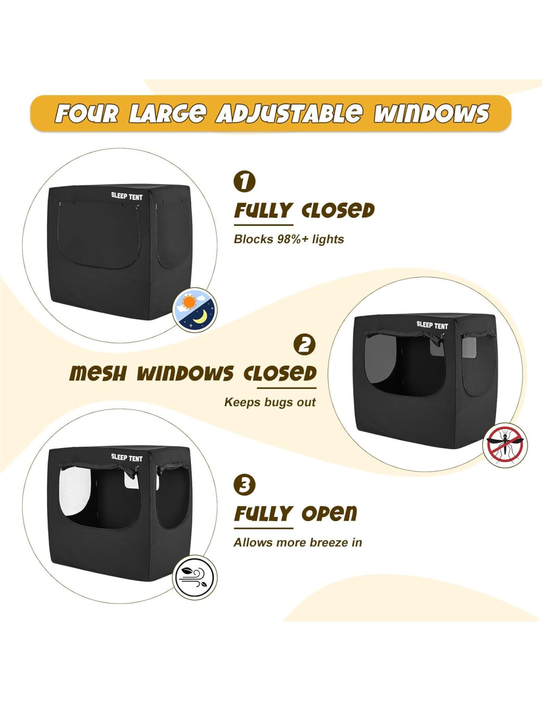 - Más Ventanas Ajustables para Flujo de Aire - Nuestra tienda de cuna blackout proporciona diferentes efectos de sombreado y ventilación con 4 ventanas de aire ajustables. Puedes ajustar estas ventanas según tus necesidades y las de tu bebé. Por ejemplo, si deseas mantener un efecto de sombreado del 70% y vigilar a tus pequeños, puedes cerrar solo la capa de malla.